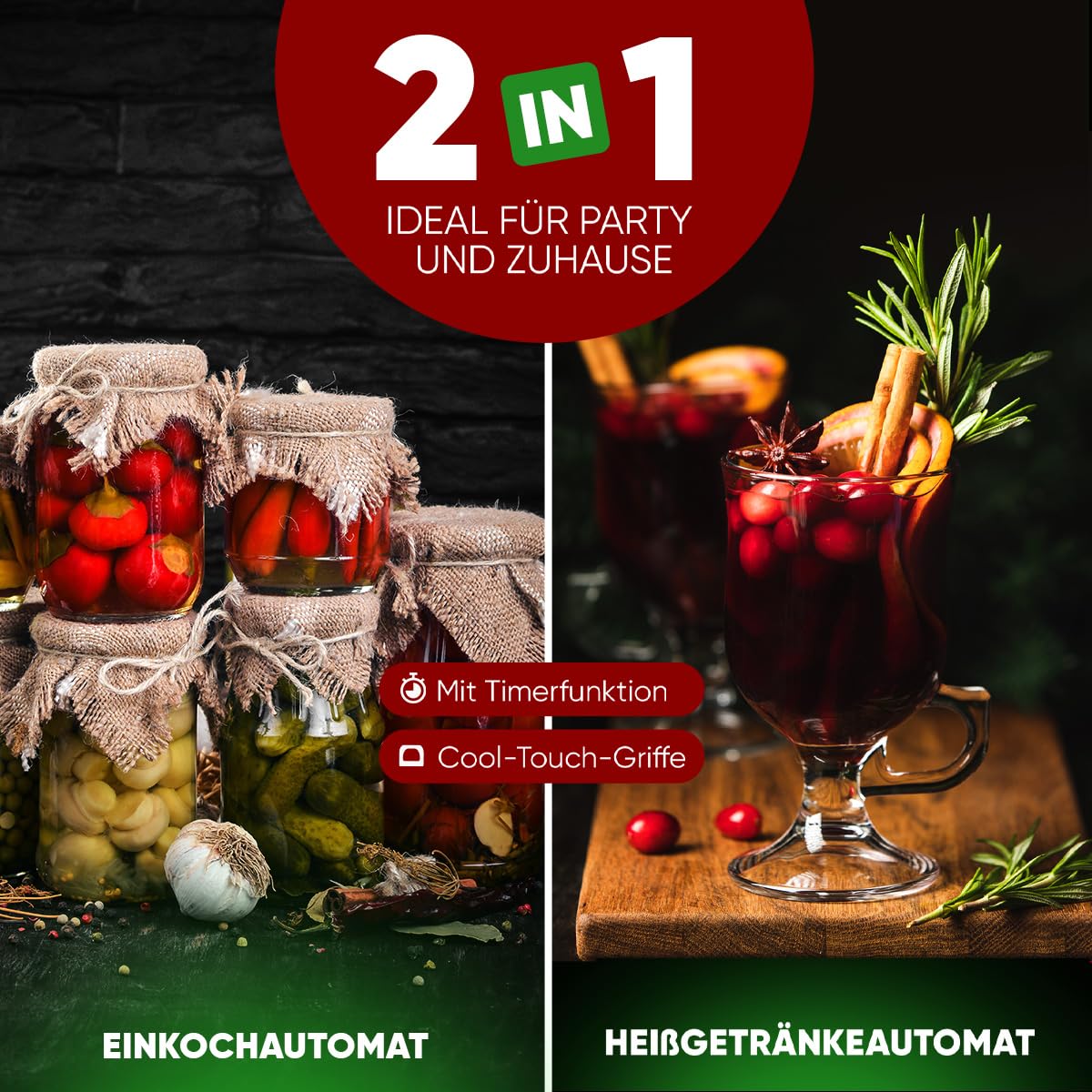 Dieser 2in1 Automat ist extrem vielseitig. Er eignet sich perfekt zum Konservieren von Obst, Gemüse und Marmelade, aber auch zum Zubereiten, Warmhalten und Servieren von Glühwein, Punsch oder Suppen bei Feiern und im Winter.