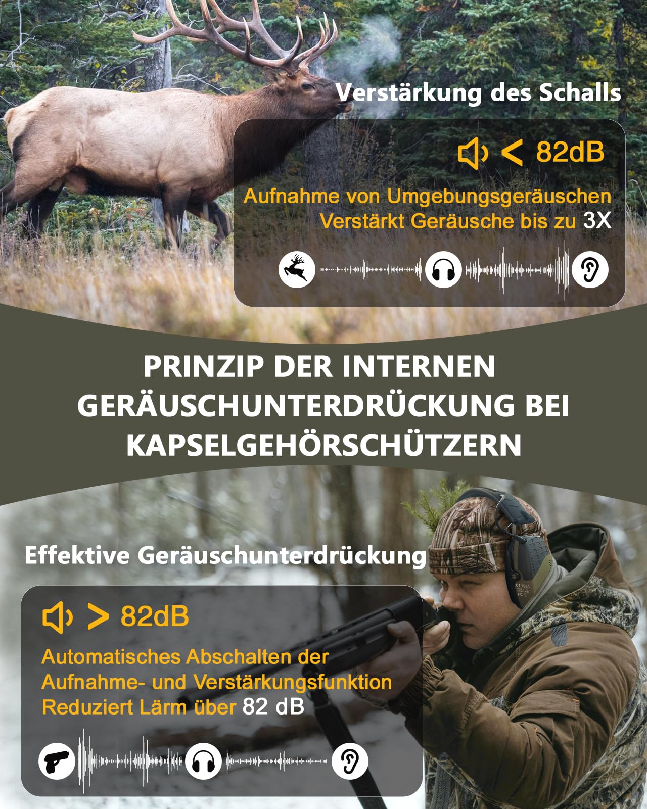 Die Elektronik blockiert automatisch alle schädlichen Impulsgeräusche über 82 dB (wie einen Schuss) und schützt so Ihr Gehör. Gleichzeitig verstärken die integrierten Mikrofone leise Umgebungsgeräusche, sodass Sie Gespräche oder die Umgebung weiterhin klar und deutlich wahrnehmen können.