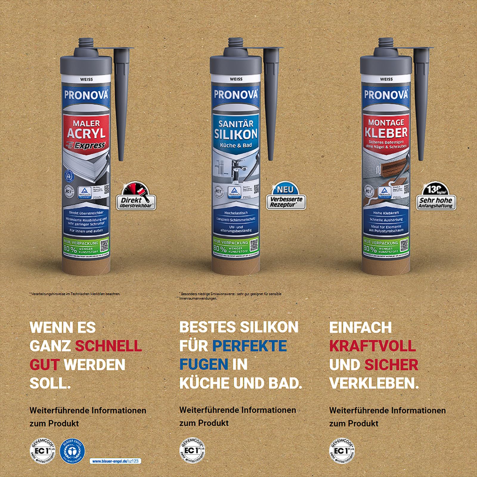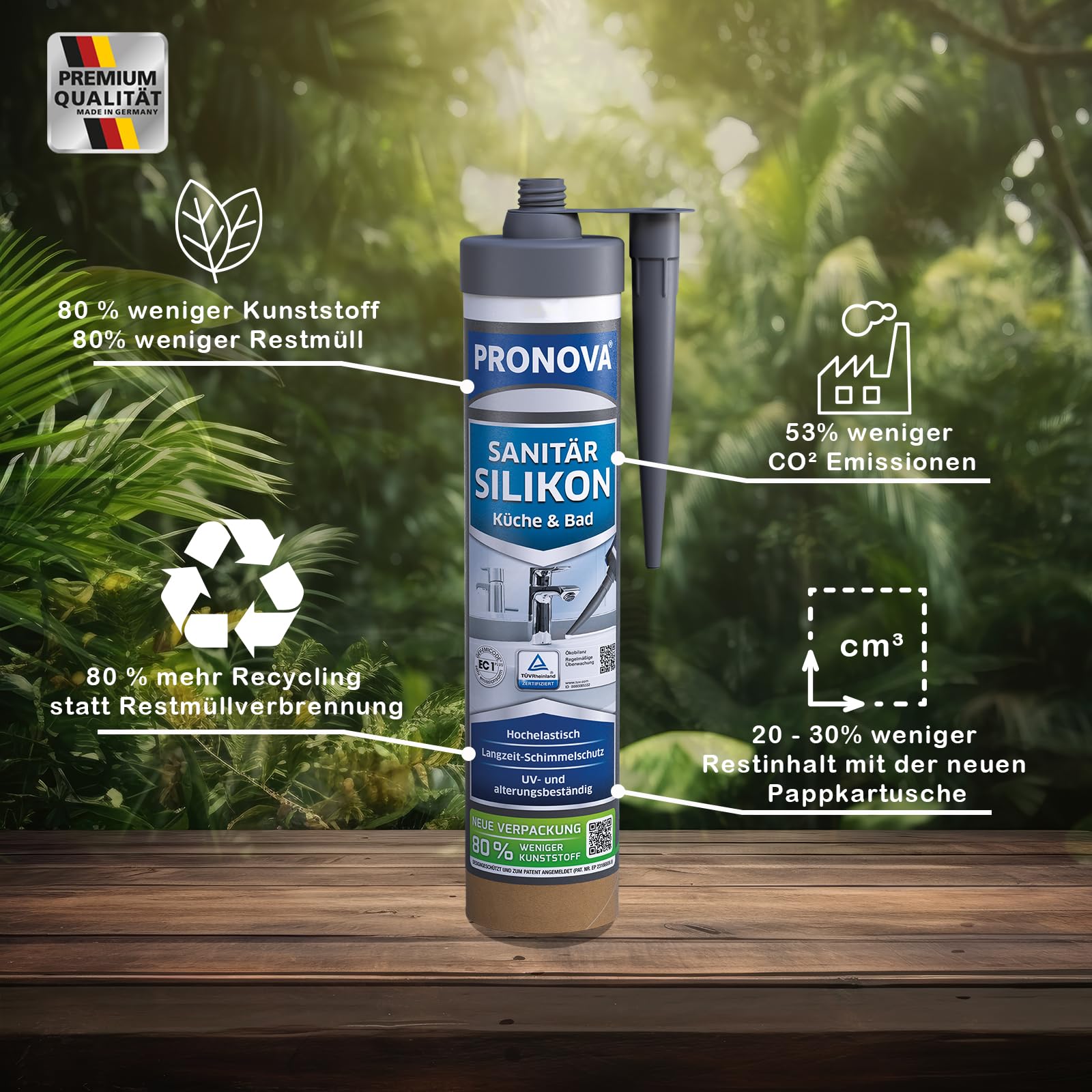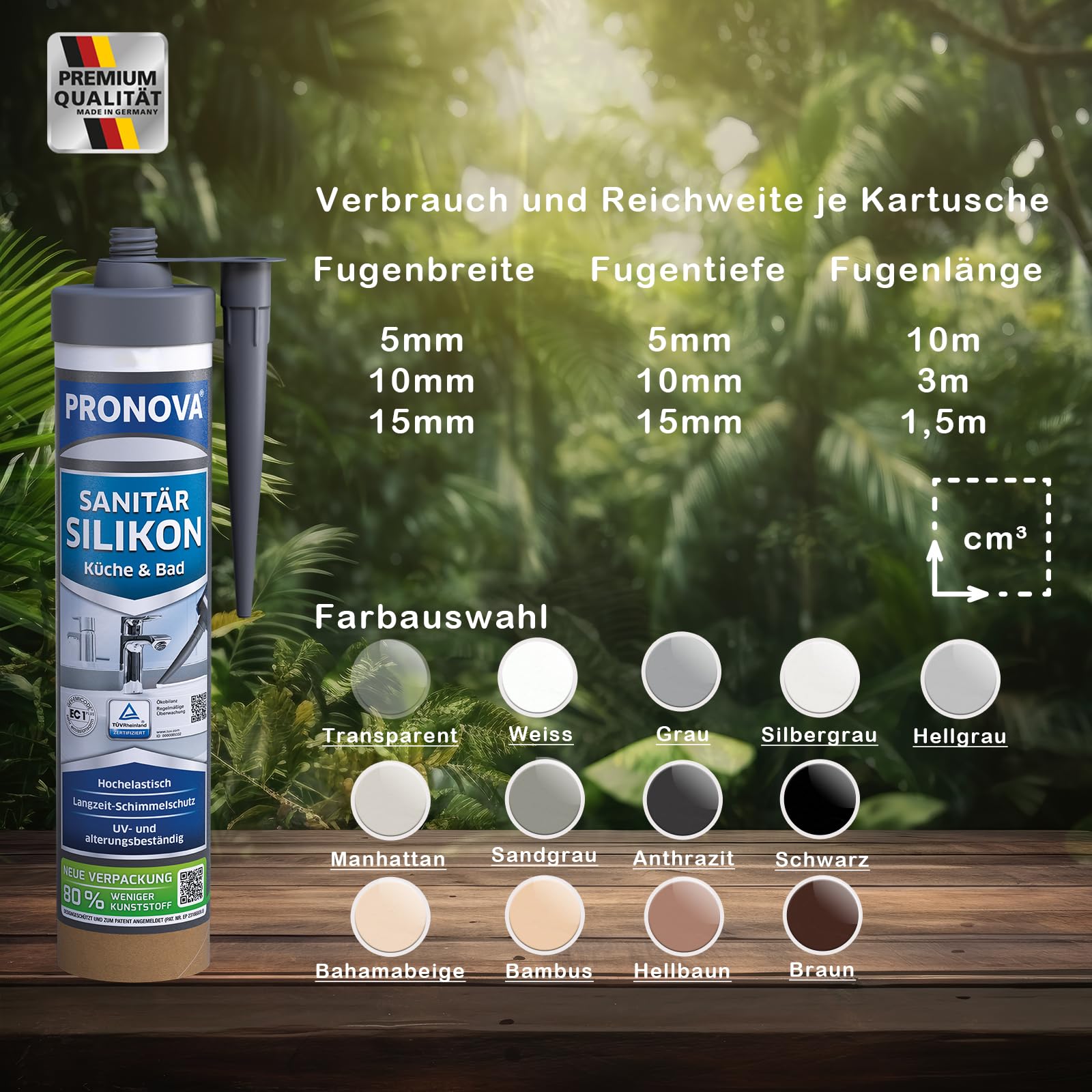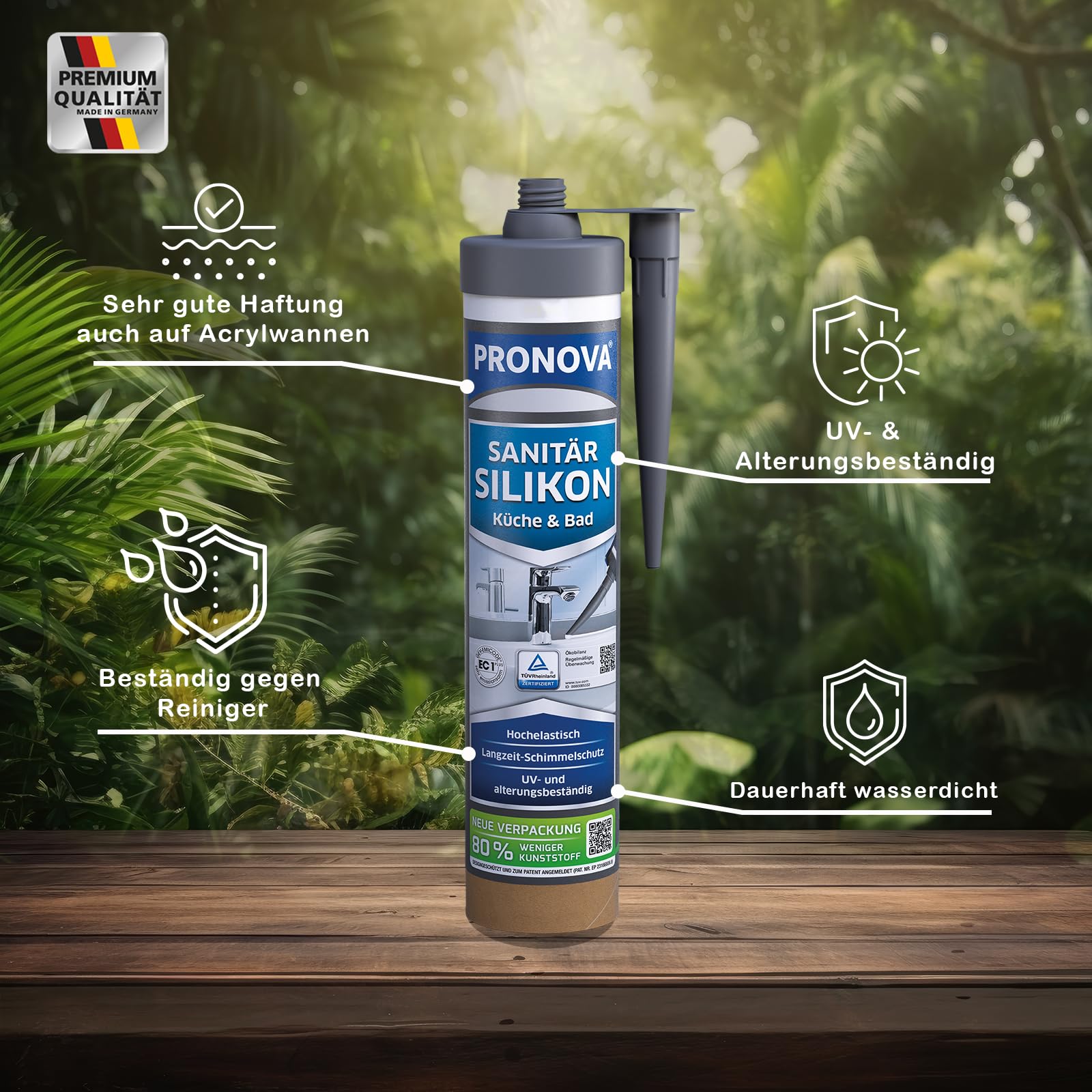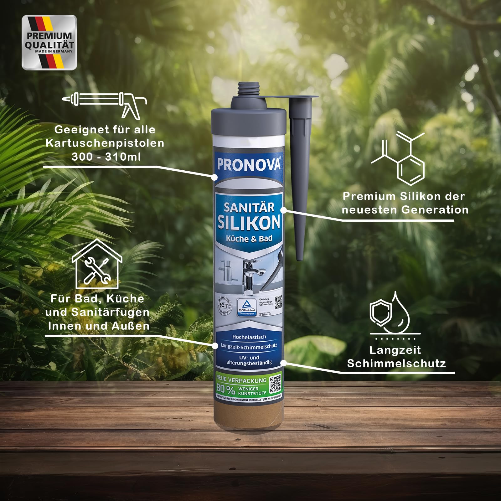 Verabschieden Sie sich von unschönen und unhygienischen Schimmelflecken. Das Pronova Sanitärsilikon wurde speziell entwickelt, um eine dauerhafte Barriere gegen Feuchtigkeit und Schimmel zu schaffen. Seine hohe Elastizität stellt sicher, dass Anschluss- und Dehnungsfugen auch bei Bewegung rissfrei und dicht bleiben. Das Ergebnis sind nicht nur funktionale, sondern auch ästhetisch ansprechende Fugen, die über Jahre hinweg sauber bleiben.
