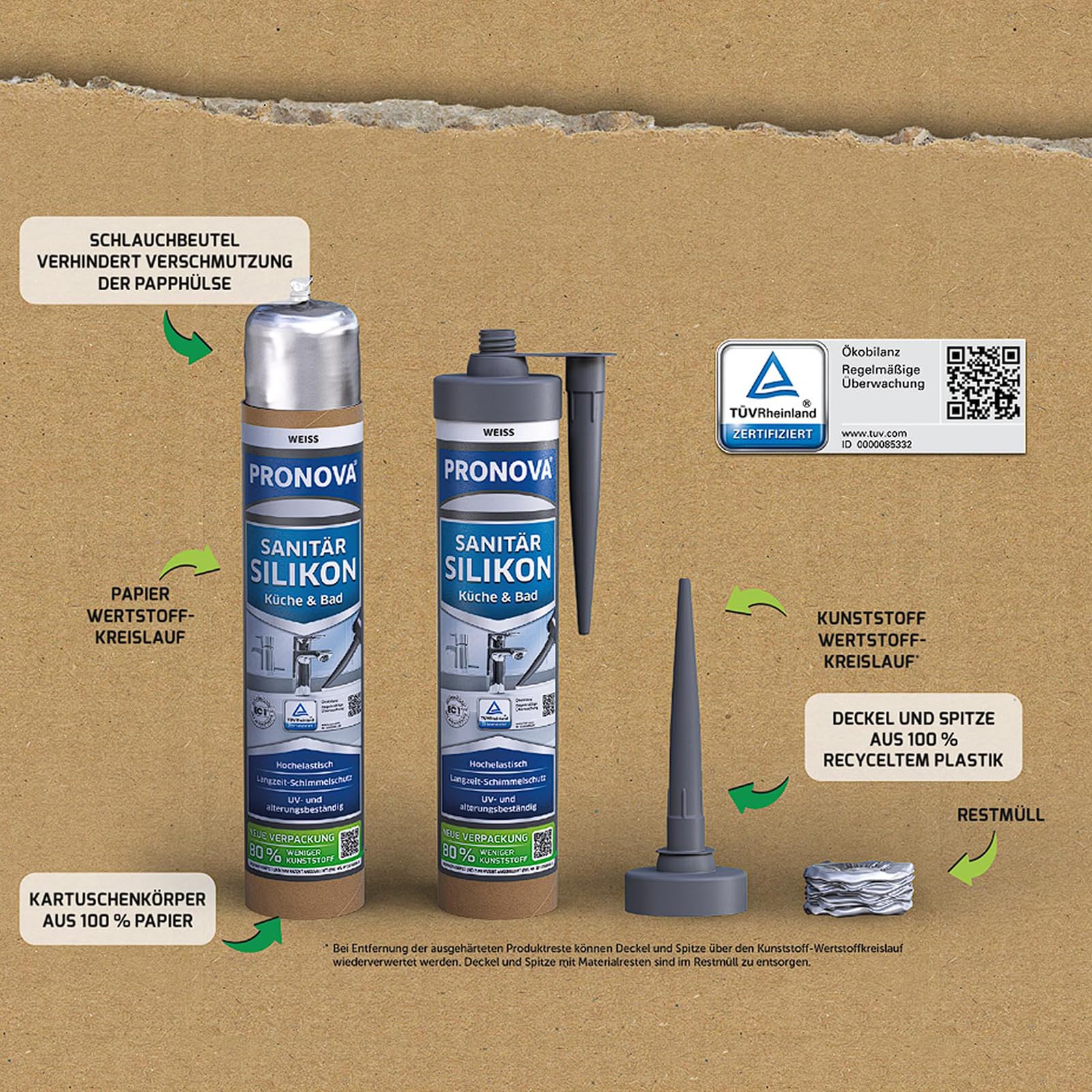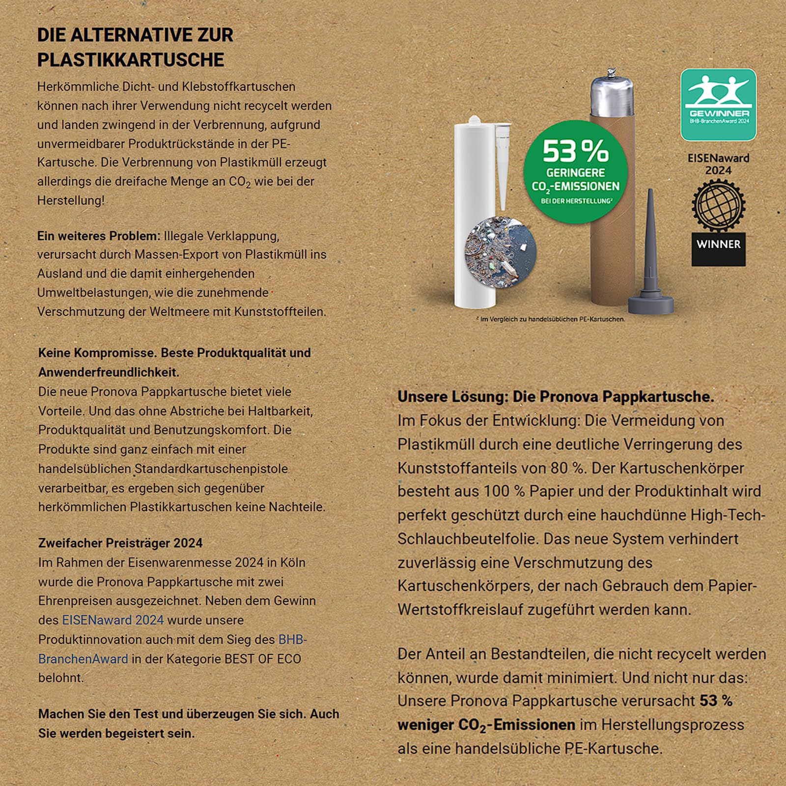 Die innovative Kartusche besteht aus einer Papphülse statt aus Vollplastik. Dies reduziert den Kunststoffabfall um 80 % und den CO₂-Ausstoß bei der Herstellung um 53 %, was das Produkt zu einer nachhaltigeren Wahl macht.