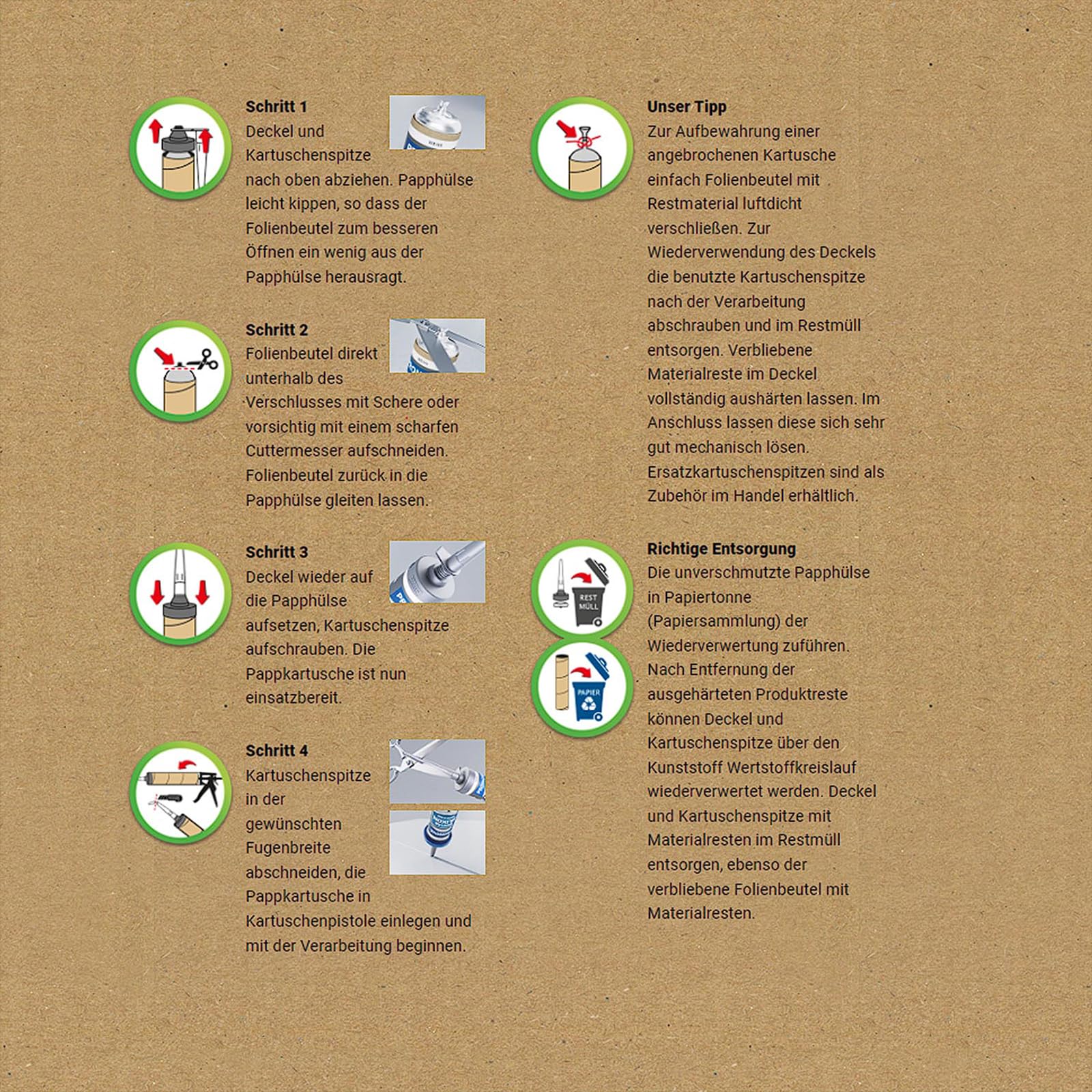 Die Verarbeitung erfolgt mit einer handelsüblichen Kartuschenpistole. Schneiden Sie die Kartuschenspitze in der gewünschten Fugenbreite ab und tragen Sie das Silikon gleichmässig auf. Angebrochene Kartuschen können aufbewahrt werden, indem der Folienbeutel luftdicht verschlossen wird. Bitte beachten Sie, dass das Silikon nicht für PP, PE, Teflon und Naturstein geeignet ist.