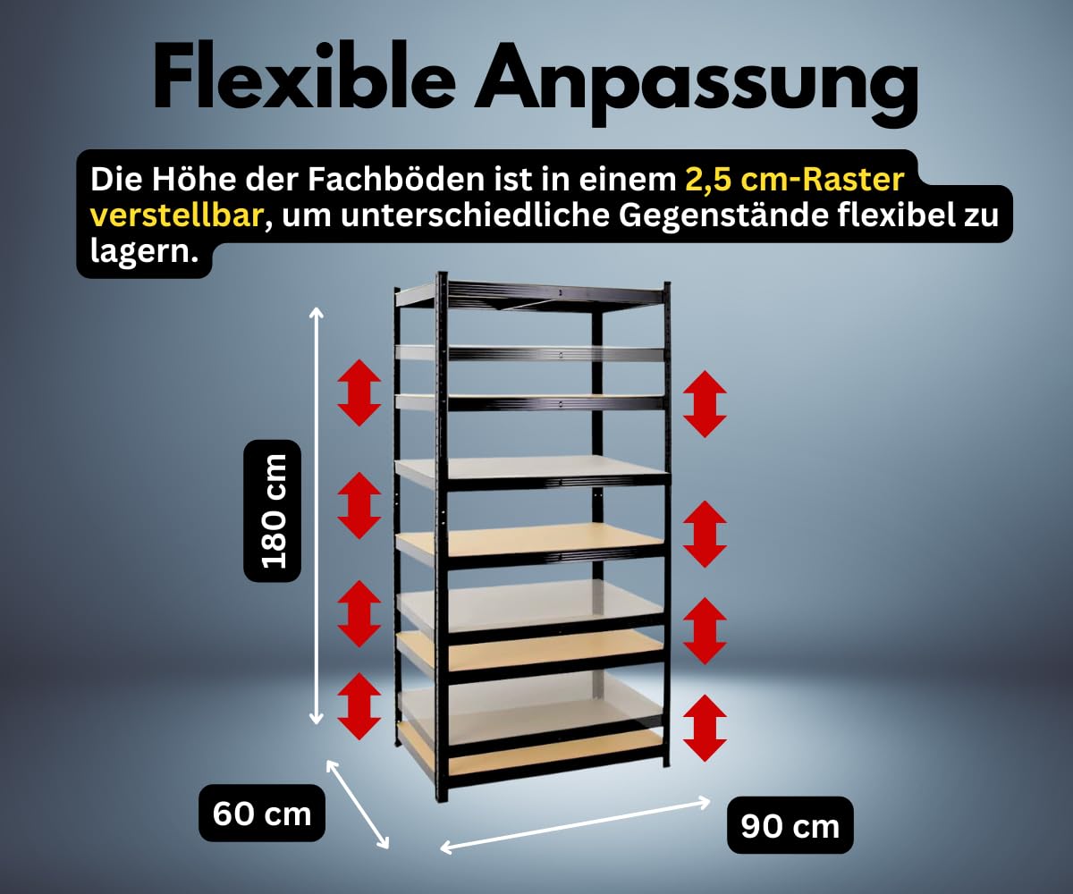 Dank der hochwertigen Stahlkonstruktion und der pulverbeschichteten Oberfläche ist dieses Regal nicht nur äusserst langlebig, sondern auch sicher im Gebrauch, da es keine scharfen Schnittkanten aufweist. Jeder der fünf Fachböden wird durch zwei Mittelträger verstärkt und kann mit bis zu 175 kg belastet werden. Die Höhe der Böden lässt sich flexibel in einem 3,5-cm-Raster anpassen, sodass Sie den Stauraum perfekt auf Ihre Bedürfnisse abstimmen können.