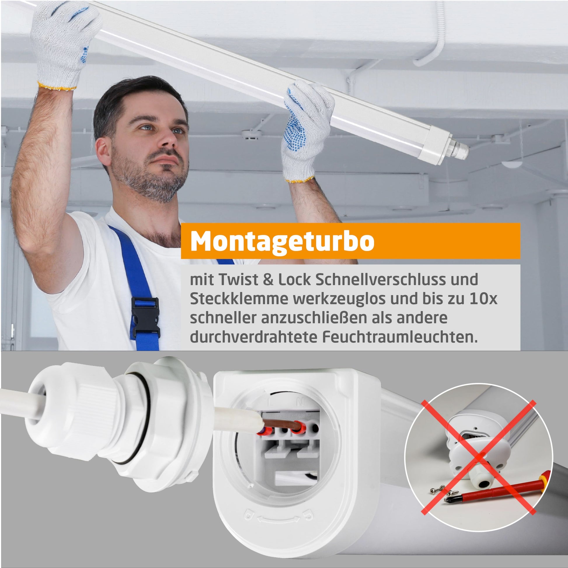 Dieses 4er-Pack an LED Feuchtraumleuchten ist die ideale und effiziente Lichtlösung für anspruchsvolle Umgebungen, in denen Helligkeit und Widerstandsfähigkeit gefordert sind.