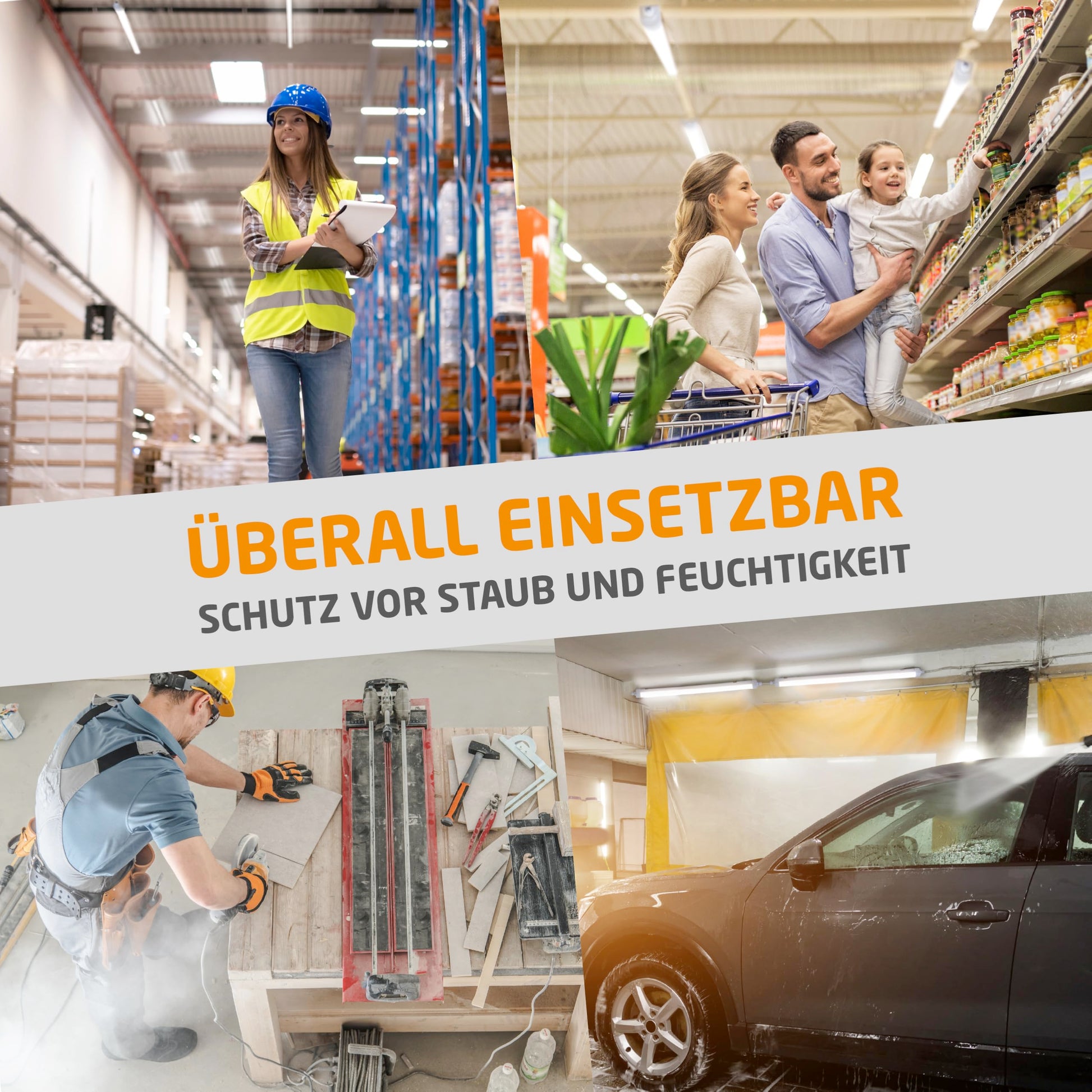 Ob in der staubigen Werkstatt, der feuchten Garage, im Keller oder in überdachten Aussenbereichen – diese Wannenleuchte ist für herausfordernde Bedingungen konzipiert. Ihre robuste Bauweise garantiert eine zuverlässige und langanhaltende Funktion, genau dort, wo Sie sie benötigen.