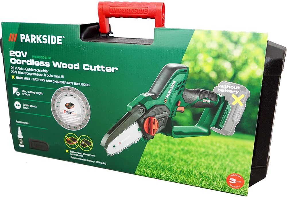 Das Set beinhaltet den 20V Akku-Gehölzschneider PAGHS 20-Li, einen robusten Transportkoffer, eine Schwertschutzhülle, 50 ml Bio-Kettenöl und einen PSIDE Schlüsselanhänger mit Flaschenöffner. Wichtig: Akku und Ladegerät sind nicht enthalten.