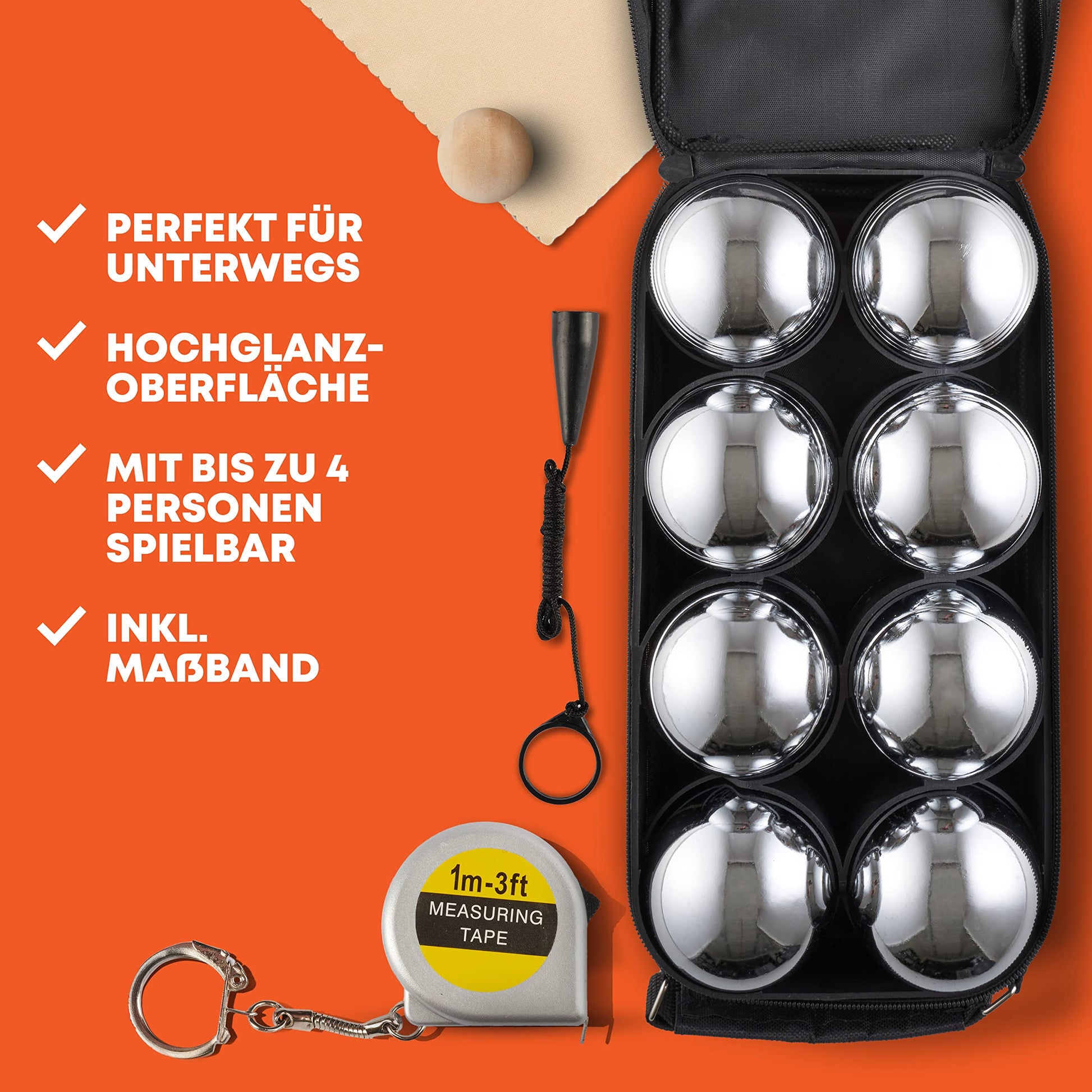 Dank der hochwertigen, hartverchromten Oberfläche investieren Sie in langanhaltenden Spielspass. Die Kugeln sind äusserst robust und halten vielen Spielsaisons stand, ohne an Qualität zu verlieren. Nehmen Sie das Spiel dank der praktischen Tragetasche einfach überallhin mit und geniessen Sie den klassischen Zeitvertreib, wo immer Sie möchten.