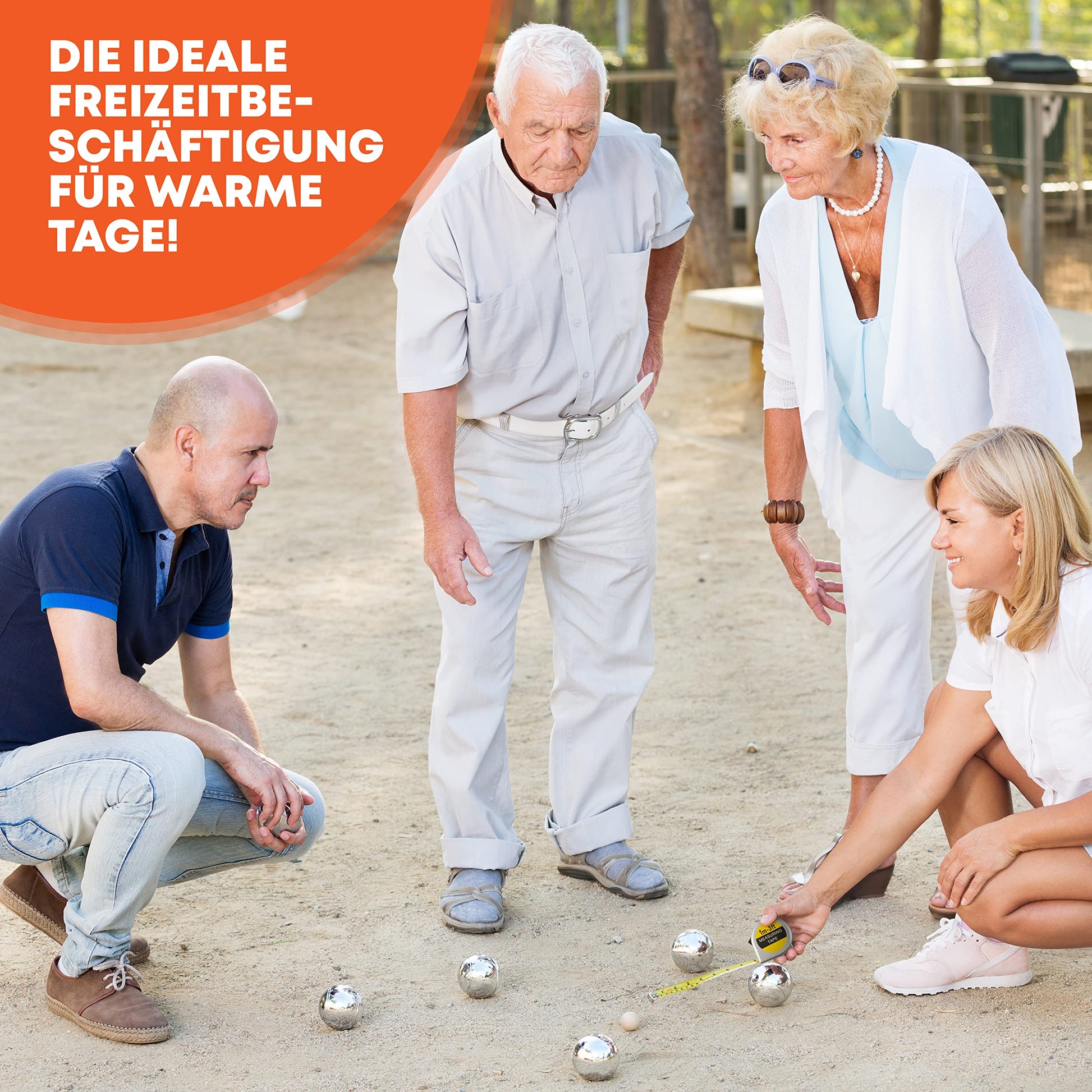Das Set ist sofort spielbereit und enthält alles, was Sie benötigen: 8 robuste Metallkugeln, eine Zielkugel, ein Massband für knappe Entscheidungen, ein Reinigungstuch, einen praktischen magnetischen Kugelheber sowie eine robuste Tragetasche für den einfachen Transport.