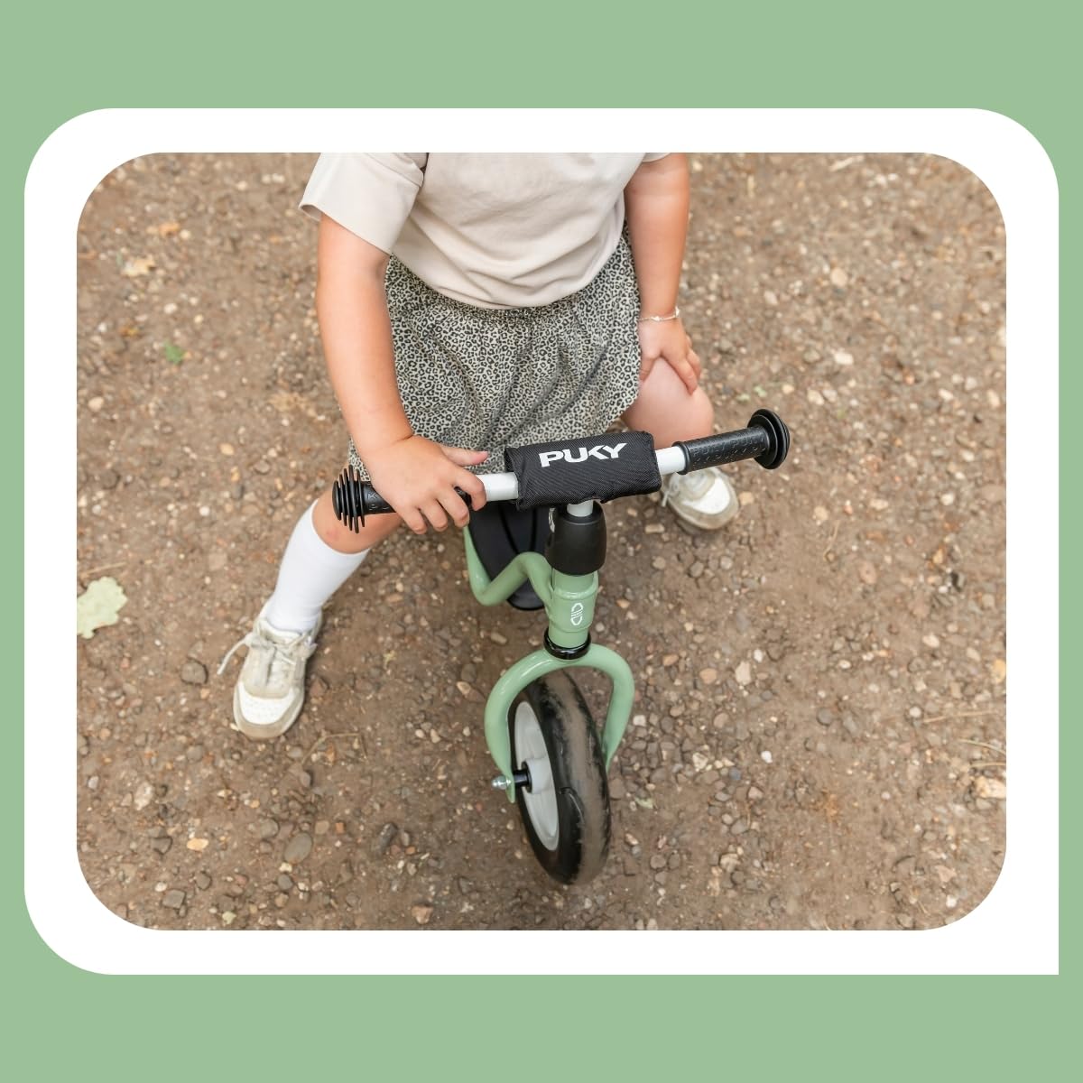 Für maximale Sicherheit ist das Laufrad mit einem PUKY Lenkerpolster (Kinnschutz) und rutschfesten Sicherheitslenkergriffen ausgestattet. Es besitzt bewusst keine Handbremse, da Kinder in diesem Alter motorisch noch nicht in der Lage sind, diese sicher zu bedienen, und stattdessen instinktiv und effektiv mit den Füssen bremsen.