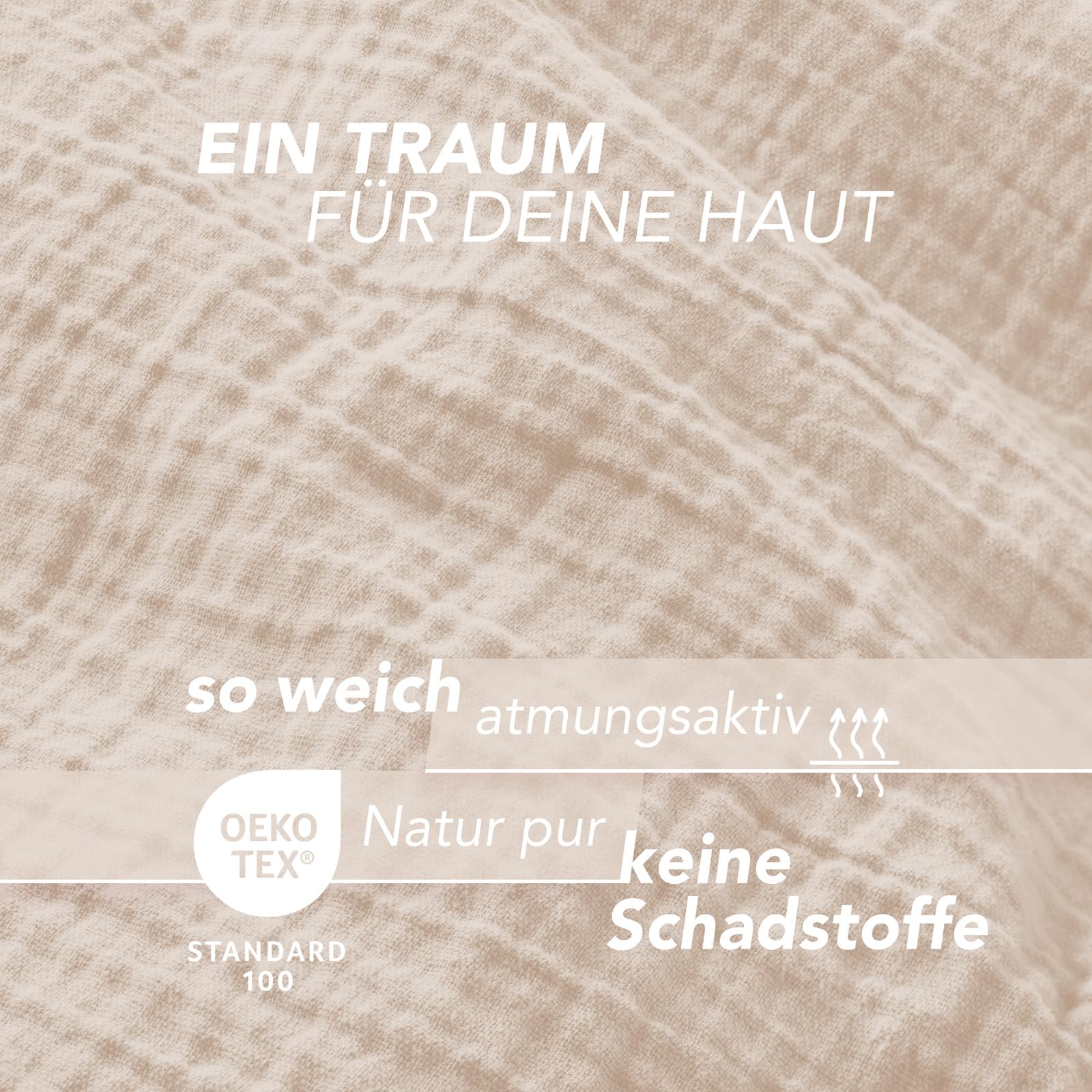 Baumwoll-Musselin ist extrem weich, leicht und sanft zur Haut. Die gewebte, luftige Struktur ist besonders atmungsaktiv, beugt nächtlichem Schwitzen vor und sorgt für ein ausgeglichenes, angenehmes Schlafklima. Mit jeder Wäsche wird der Stoff sogar noch weicher.