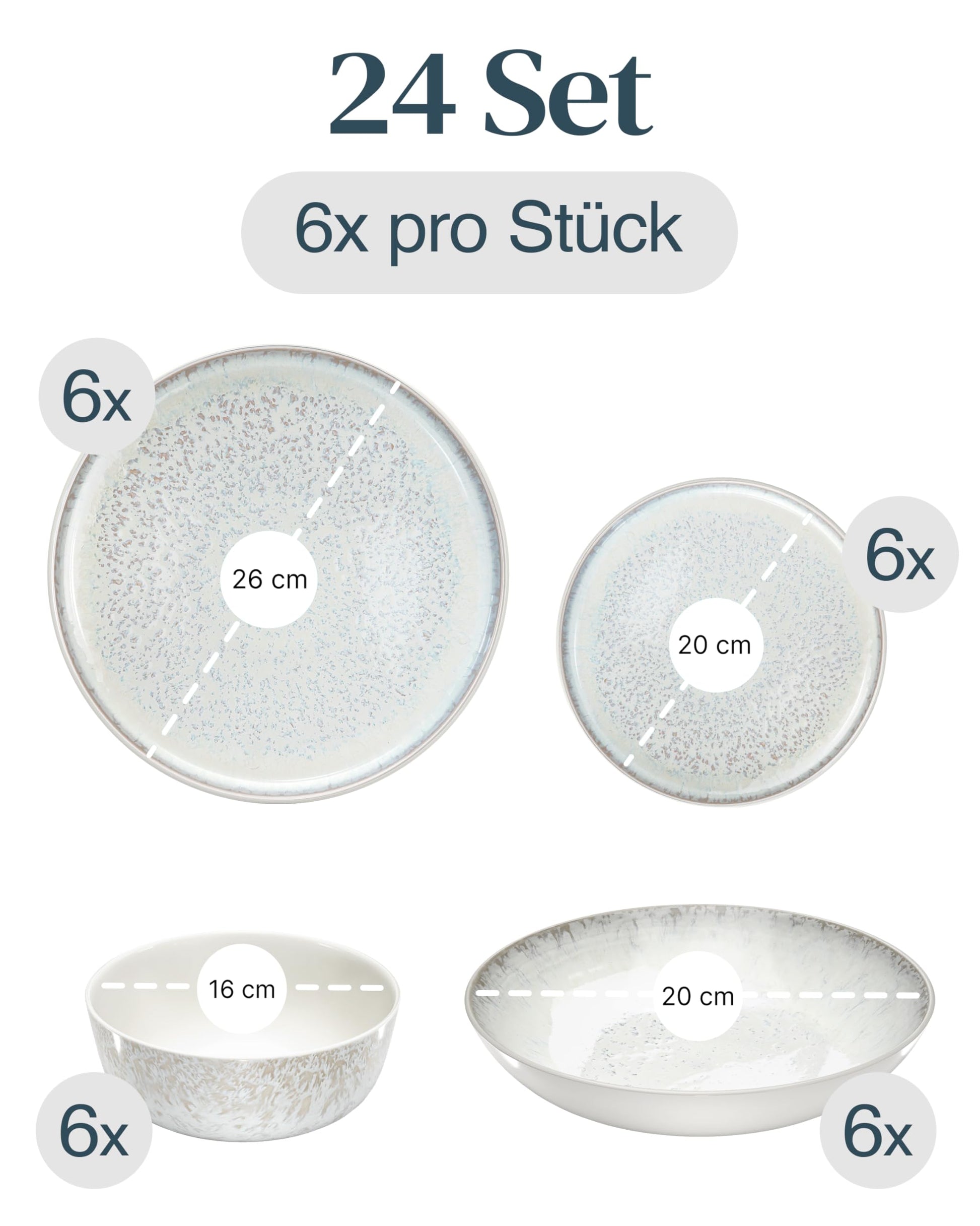 - Komplett für 6 Personen: Das 24-teilige Set beinhaltet 6 grosse Speiseteller, 6 Frühstücksteller, 6 tiefe Suppenteller sowie 6 vielseitige Schüsseln.