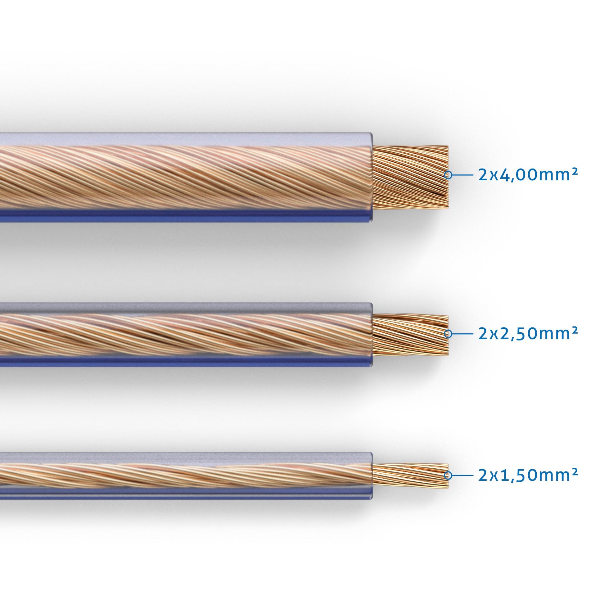 Ein Querschnitt von 4,00 mm² ist ideal für hochwertige Hifi- und Heimkino-Anlagen, besonders bei längeren Kabelwegen von über 10 Metern und für leistungshungrige Lautsprecher. Er garantiert auch auf Distanz einen minimalen Leistungsverlust und eine präzise Basskontrolle.