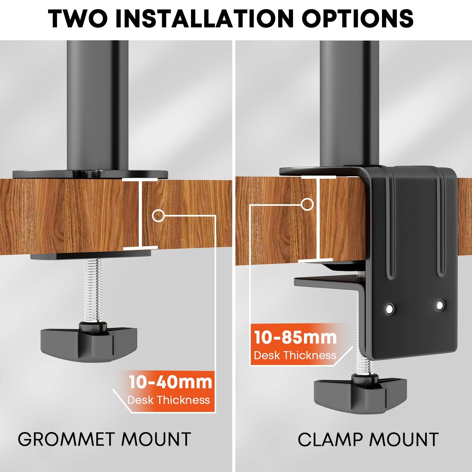 Es gibt zwei flexible Montageoptionen. Sie können die Halterung entweder mit der C-Klemme an Tischplatten mit einer Stärke von bis zu 85 mm befestigen oder die Tüllenhalterung für Schreibtische mit einer Bohrung und einer Plattenstärke von bis zu 40 mm verwenden. Das komplette Befestigungsmaterial für beide Varianten ist im Lieferumfang enthalten.