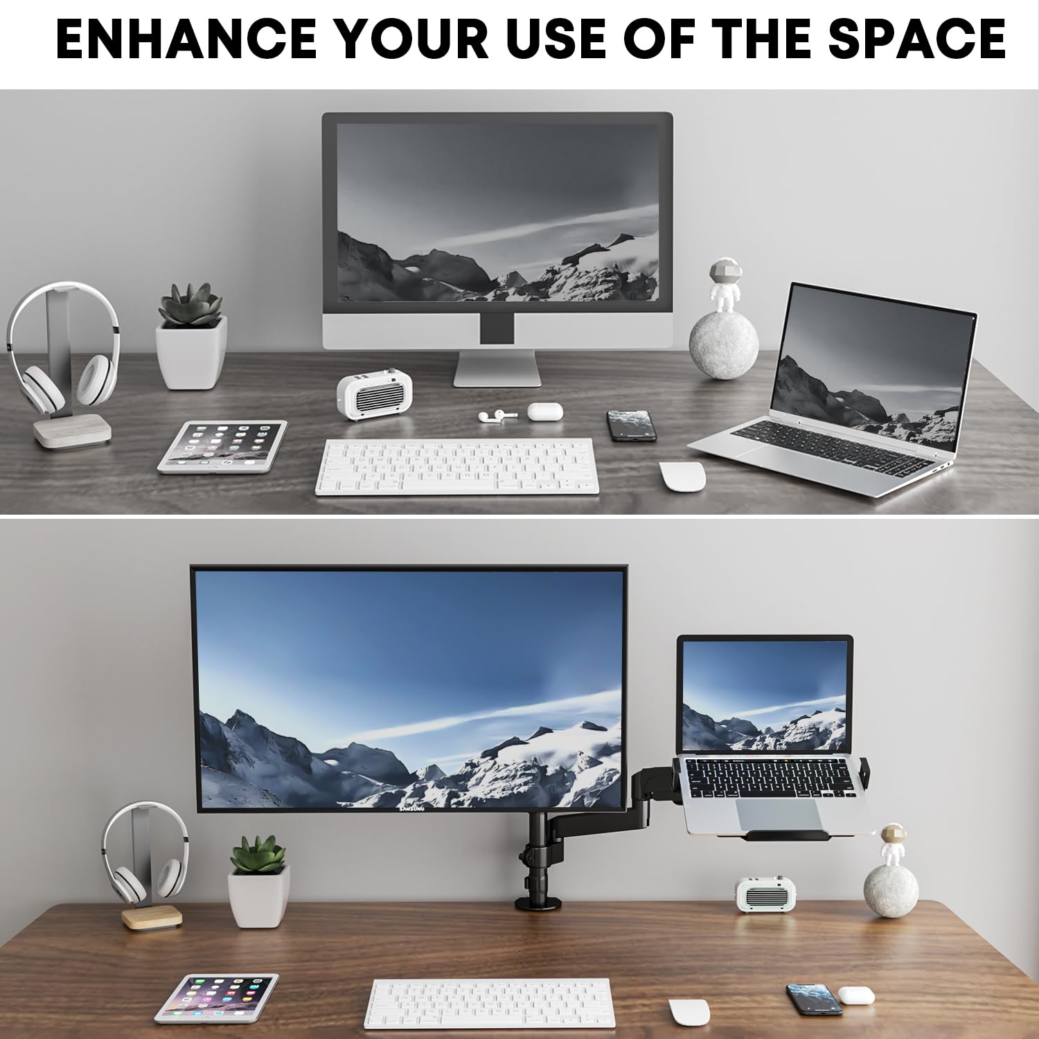 Diese flexible Halterung kombiniert einen robusten Monitorarm mit einer praktischen Laptopablage, um eine ergonomische und aufgeräumte Arbeitsumgebung zu schaffen.