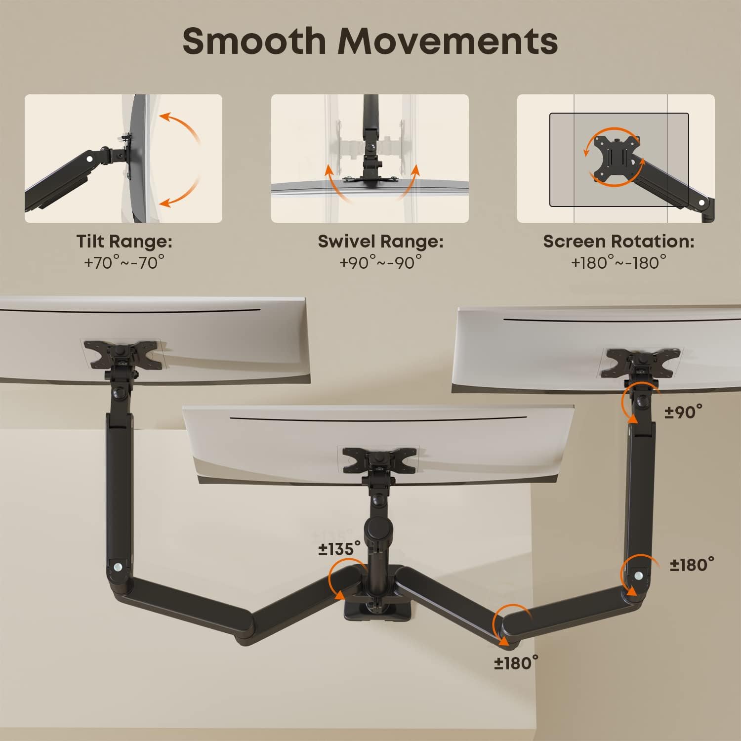 Ja, absolut. Jeder Arm ist voll beweglich und ermöglicht es Ihnen, die Monitore um ±70° zu neigen, ±90° zu schwenken und um 360° zu drehen. So finden Sie mühelos die perfekte Ausrichtung, um Nacken- und Augenbelastungen zu reduzieren.