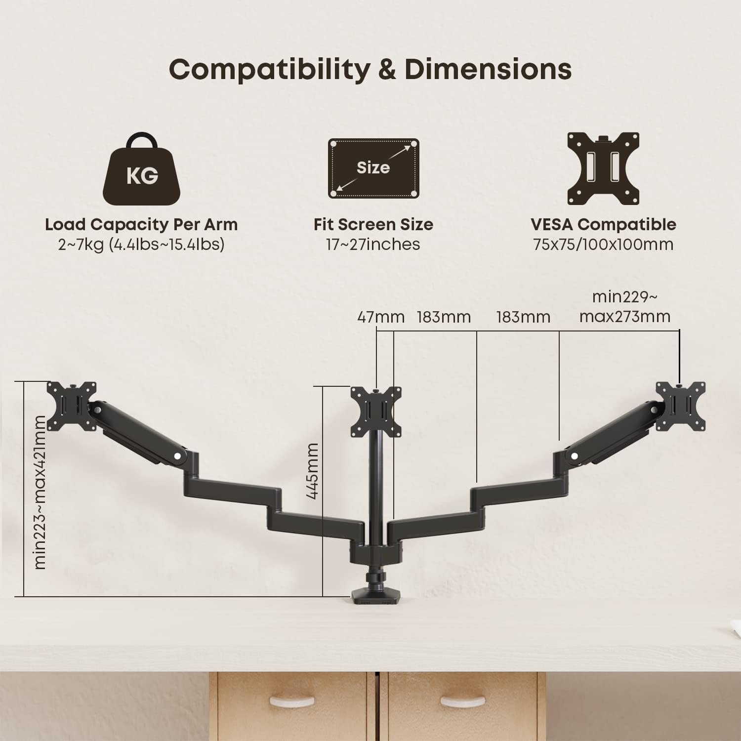 - Umfassende Kompatibilität: Geeignet für die meisten Bildschirme mit einer Diagonale von 17 bis 27 Zoll und einem maximalen Gewicht von 7 kg pro Arm.