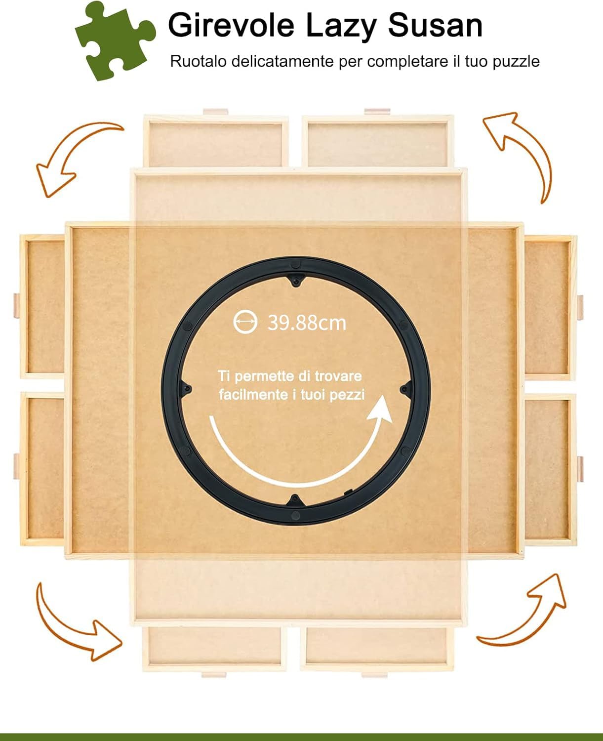 Dank des integrierten 'Lazy Susan'-Drehtellers können Sie das gesamte Brett mühelos drehen. Dadurch erreichen Sie jeden Bereich des Puzzles bequem, ohne sich verrenken oder um den Tisch herumlaufen zu müssen.