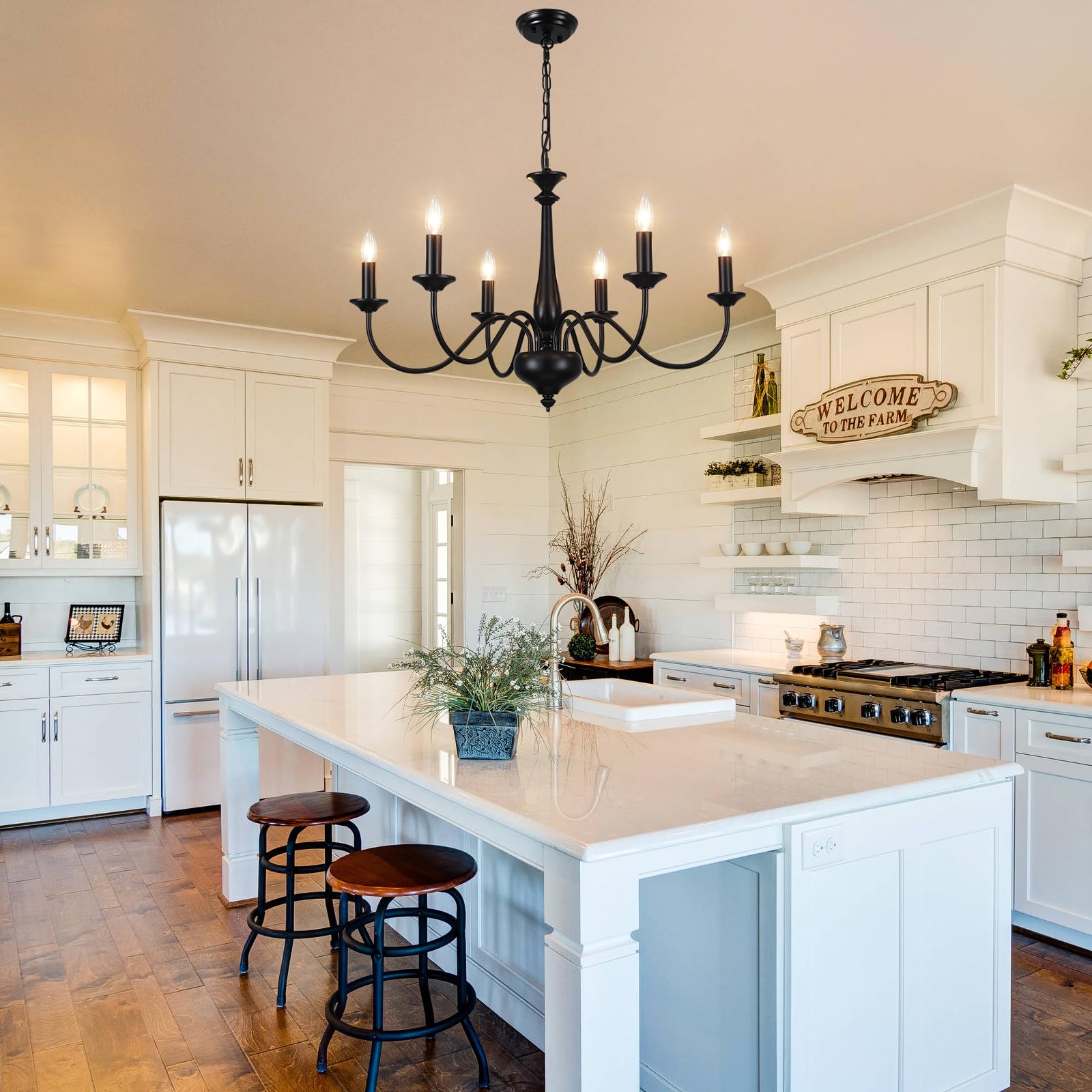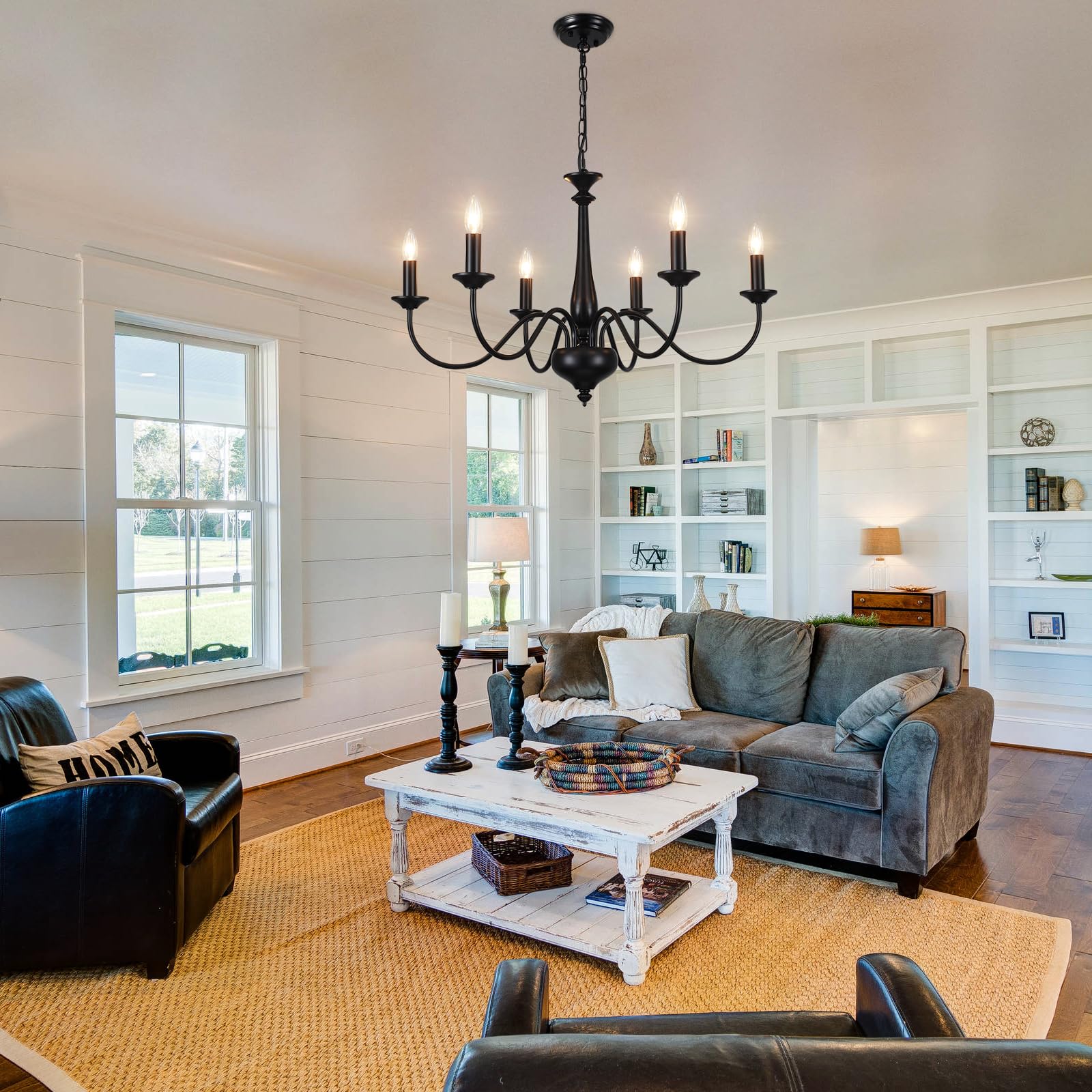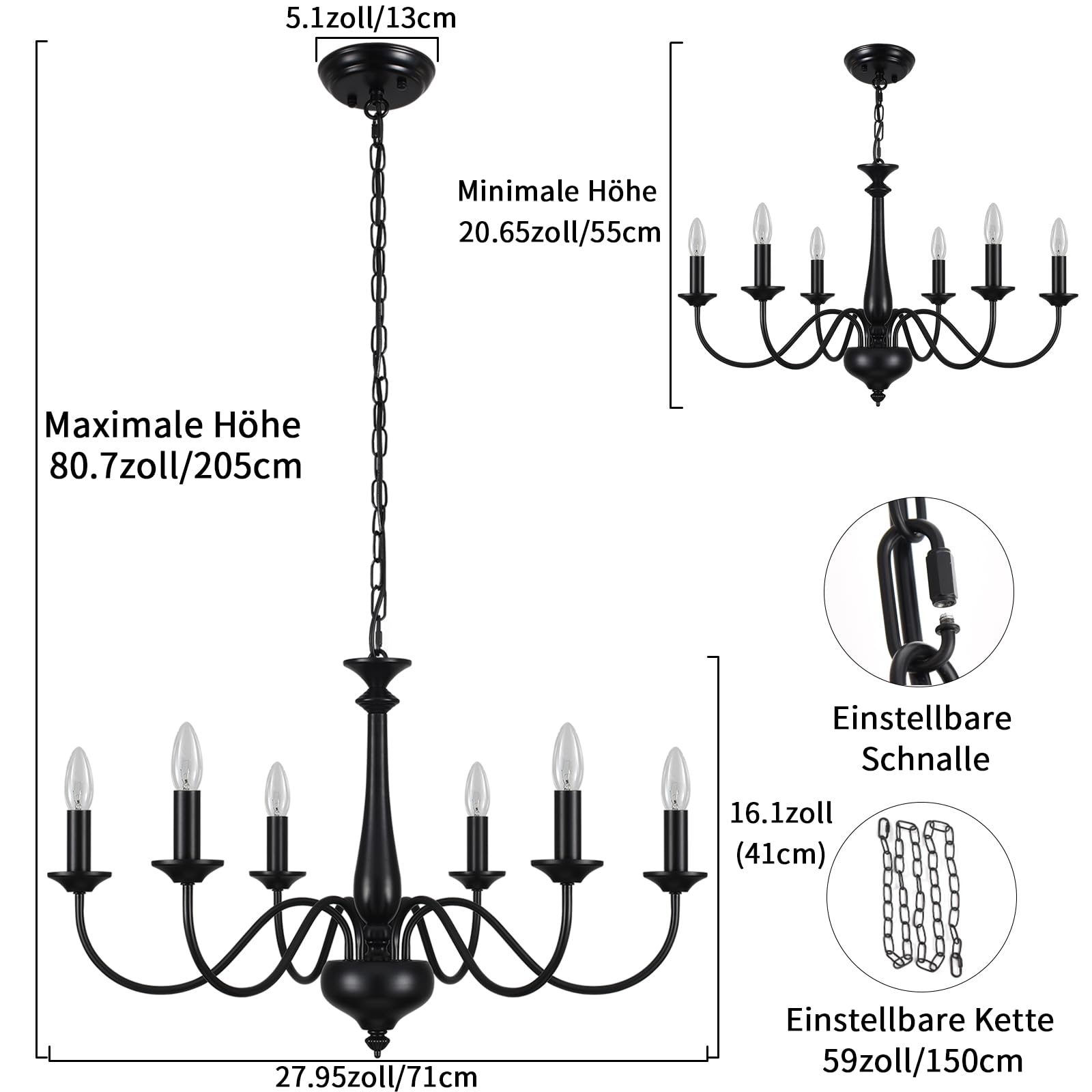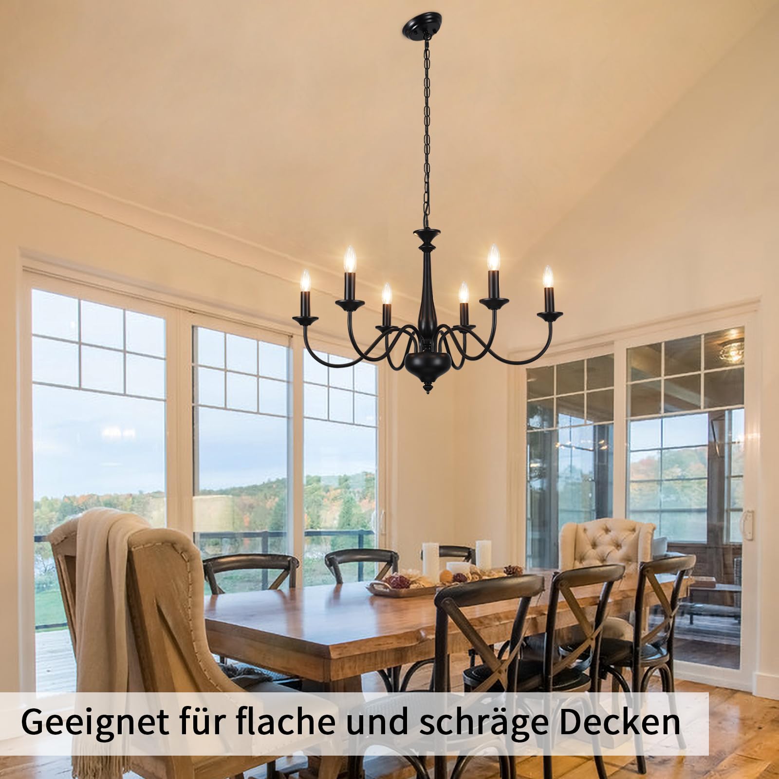 - Zeitloses Vintage-Design: Gefertigt aus mattschwarzem Eisenmetall, besticht der Leuchter durch sechs elegant geschwungene Arme, die eine klassisch-schlichte Ästhetik im Landhausstil schaffen.
