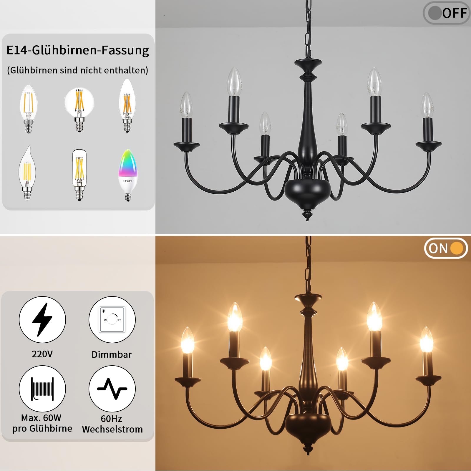 Sie benötigen sechs Leuchtmittel mit einer E14-Fassung, die nicht im Lieferumfang enthalten sind. Sie können LED-, CFL- oder Halogenlampen mit jeweils maximal 60 Watt verwenden. Um das Vintage-Design zu unterstreichen und die Dimmfunktion zu nutzen, empfehlen sich dimmbare LED-Kerzenlampen.