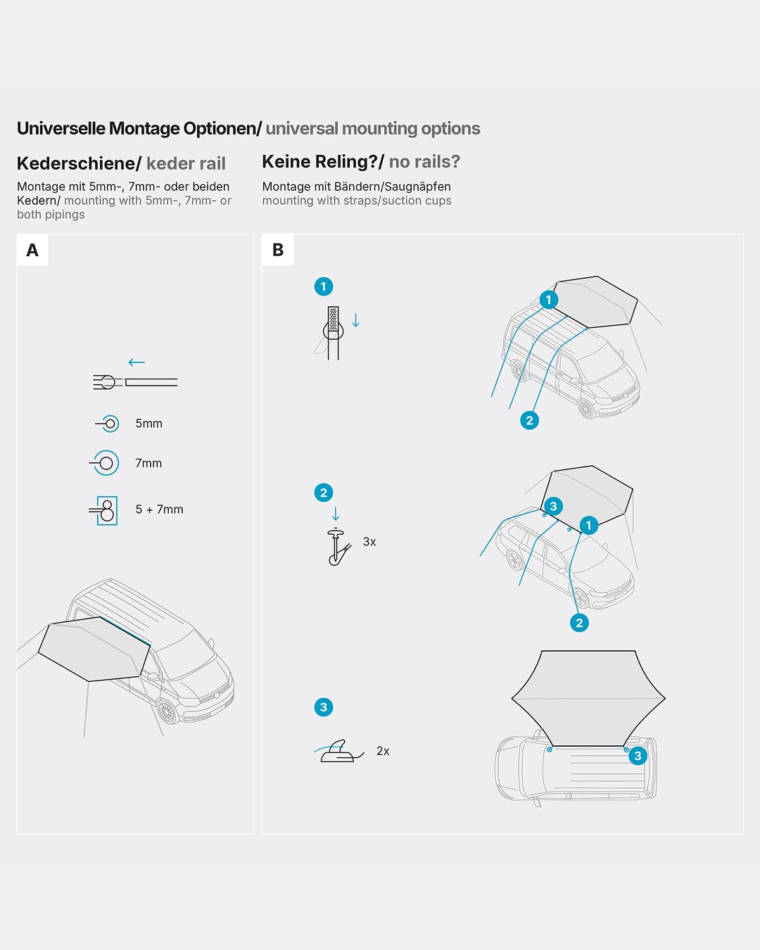 Das Sonnensegel bietet maximale Flexibilität mit drei Befestigungsmöglichkeiten: 1. Mit dem integrierten Keder (für Fahrzeuge mit Kederschiene), 2. mit den mitgelieferten starken Saugnäpfen (für glatte Dächer ohne Schiene) oder 3. indem es mit Abspannleinen an einer Dachreling oder anderen festen Punkten am Fahrzeug befestigt wird.
