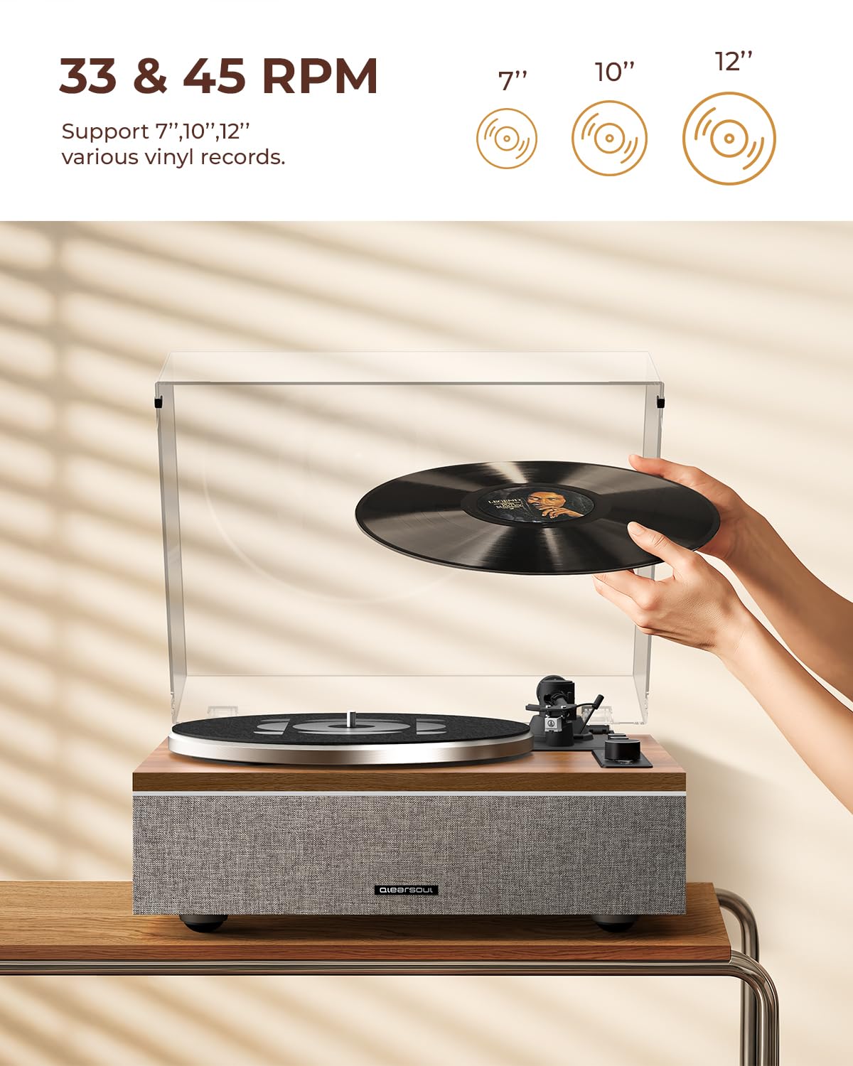 - Flexible Bluetooth-Konnektivität: Nutzen Sie den Plattenspieler als Bluetooth-Lautsprecher, indem Sie Musik von Ihrem Smartphone streamen, oder senden Sie den analogen Klang Ihrer Platten kabellos an externe Bluetooth-Kopfhörer oder -Boxen.