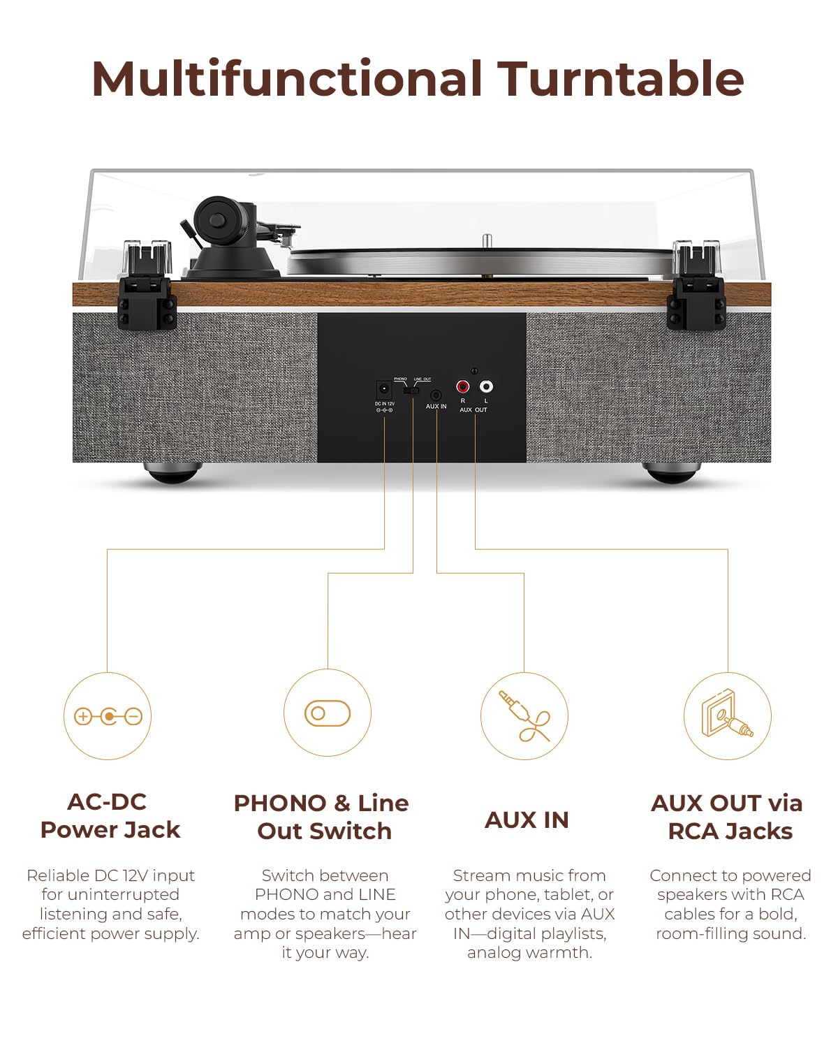 - Vielseitige Anschlussoptionen: Ein eingebauter, umschaltbarer Phono-Vorverstärker ermöglicht den direkten Anschluss an jede Stereoanlage (via PHONO/LINE-Ausgang), während ein 3,5-mm-AUX-Eingang zusätzliche Geräte willkommen heisst.