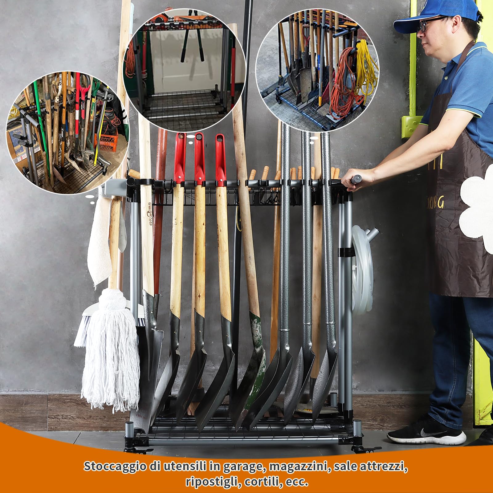 - Grosszügiger Stauraum: Bietet Platz für bis zu 20 langstielige Werkzeuge wie Rechen oder Schaufeln, fünf Halterungen für Besen und Mopps sowie zusätzlichen Stauraum für Kleinteile, Kabel und Schläuche.