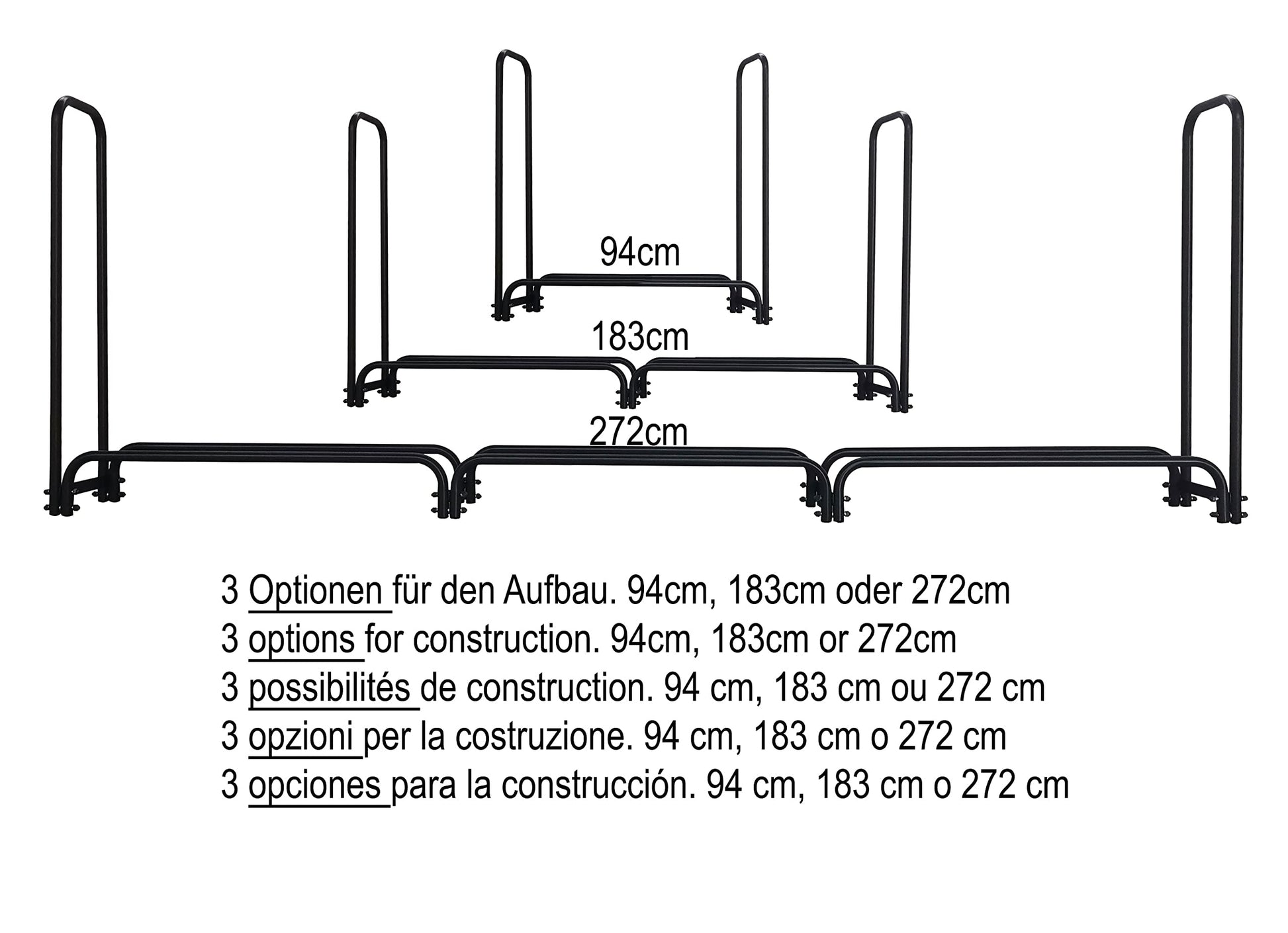 Die ausserordentliche Stabilität wird durch dicke Stahlrohre (25 mm Durchmesser, 1,5 mm Materialstärke) garantiert. Das Regal ist als freistehender Kaminholzunterstand konzipiert, kann aber für zusätzliche Sicherheit bei voller Beladung an einer Hauswand verankert werden.