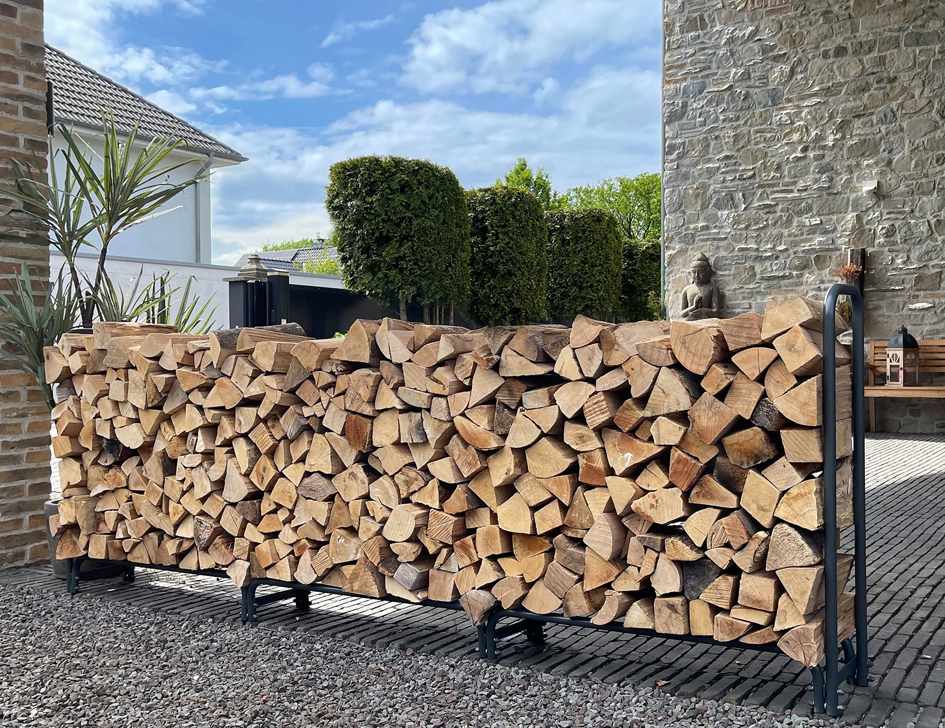 Dank einer praktischen Tiefe von 25 cm ist dieses Regal ideal für die Lagerung verschiedener Holzscheitlängen von 25 cm bis hin zu 40 cm. So bleibt Ihr Holzstapel stets sicher und stabil. Es handelt sich um ein Schwerlastregal, das für eine grosse Menge Holz ausgelegt ist.