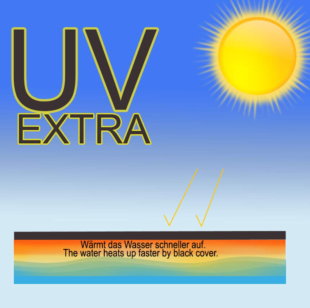 Dank ihrer schwarzen Farbe absorbiert die Oberfläche der Plane die Sonnenenergie sehr effizient und gibt die Wärme direkt an das darunterliegende Poolwasser ab. Dieser Solareffekt erhöht auf natürliche Weise die Wassertemperatur, verlängert die Badesaison und kann Heizkosten senken.