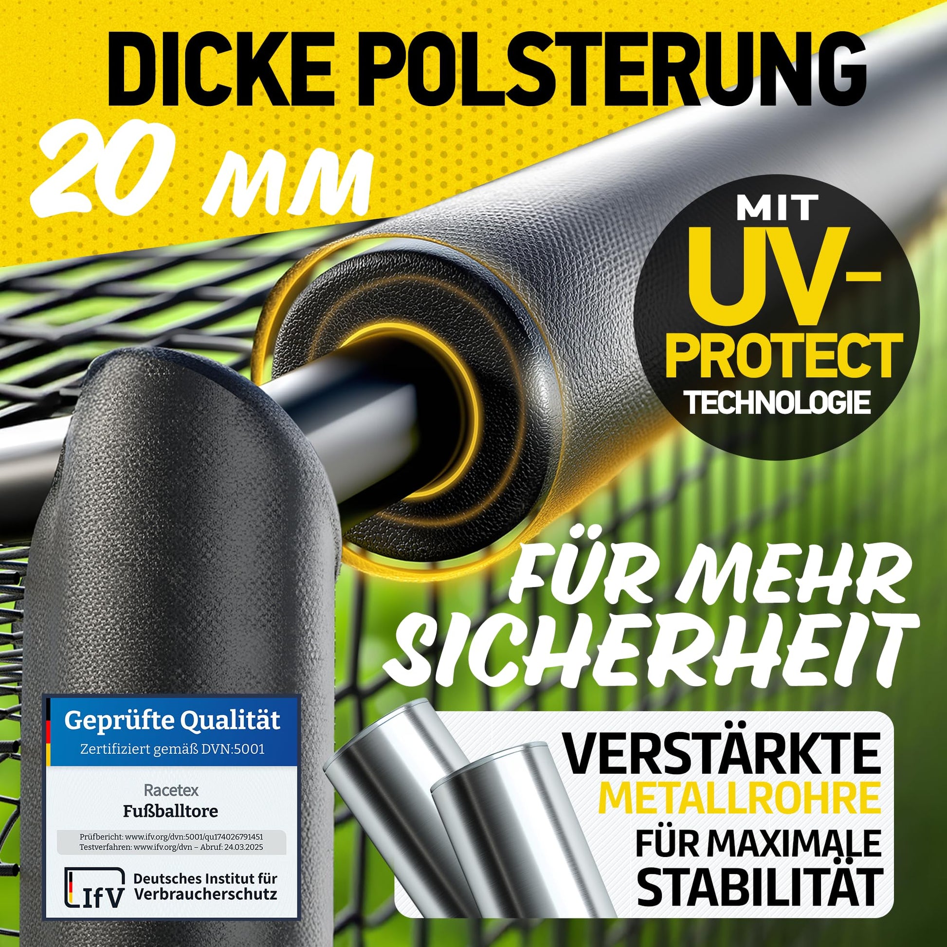 Die Sicherheit steht im Vordergrund: Die Pfosten und die Querlatte sind komplett mit einer dicken Schaumstoffpolsterung ummantelt. Diese umfassende Rundum-Polsterung minimiert das Verletzungsrisiko bei Zusammenstössen und ermöglicht unbeschwerten Spielspass für Kinder und Erwachsene.