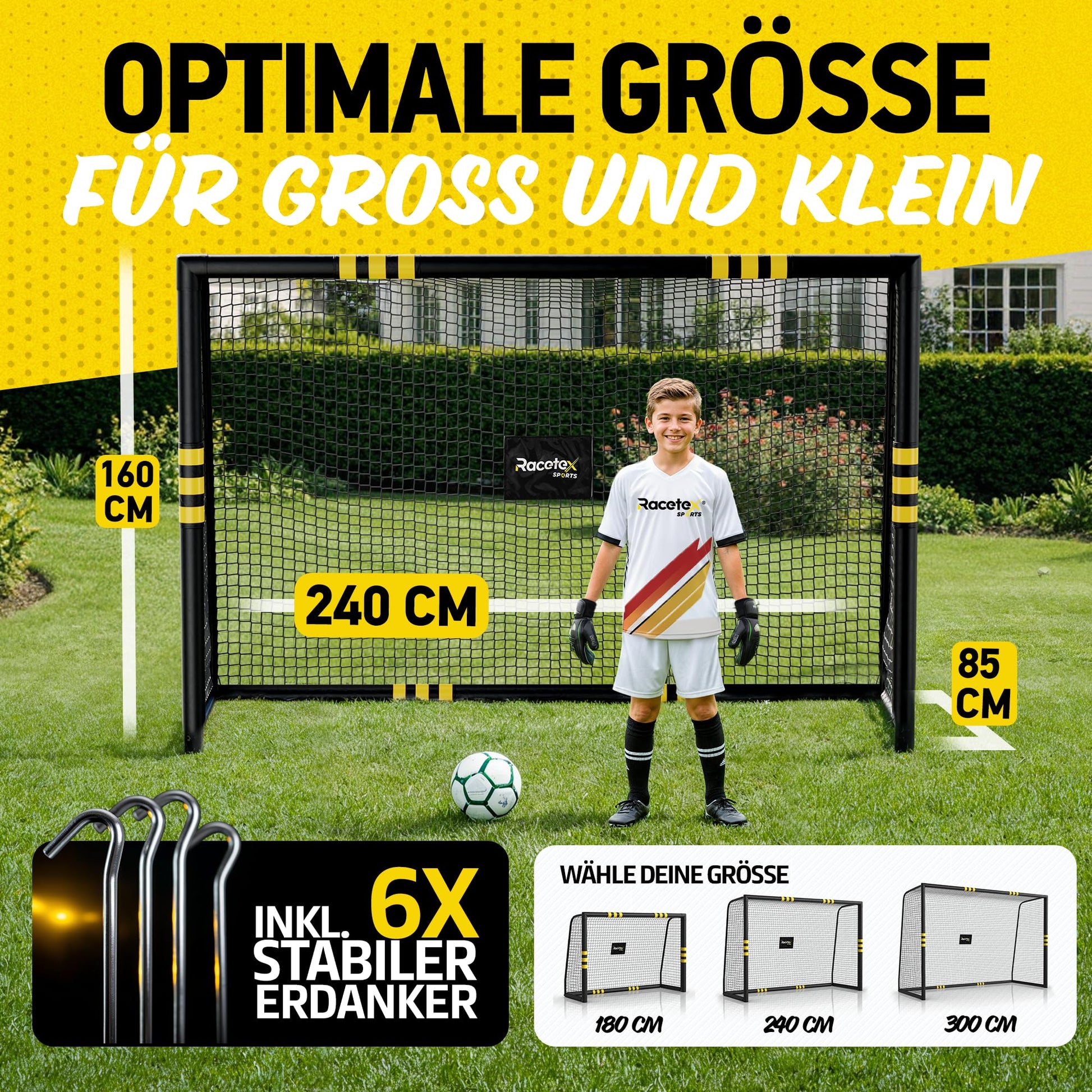 Mit den Massen 240cm x 160cm ist dieses Tor ideal für Kinder und Erwachsene. Es passt perfekt in die meisten Gärten und verwandelt diese in eine private Fussballarena für spannende Matches mit Familie und Freunden.