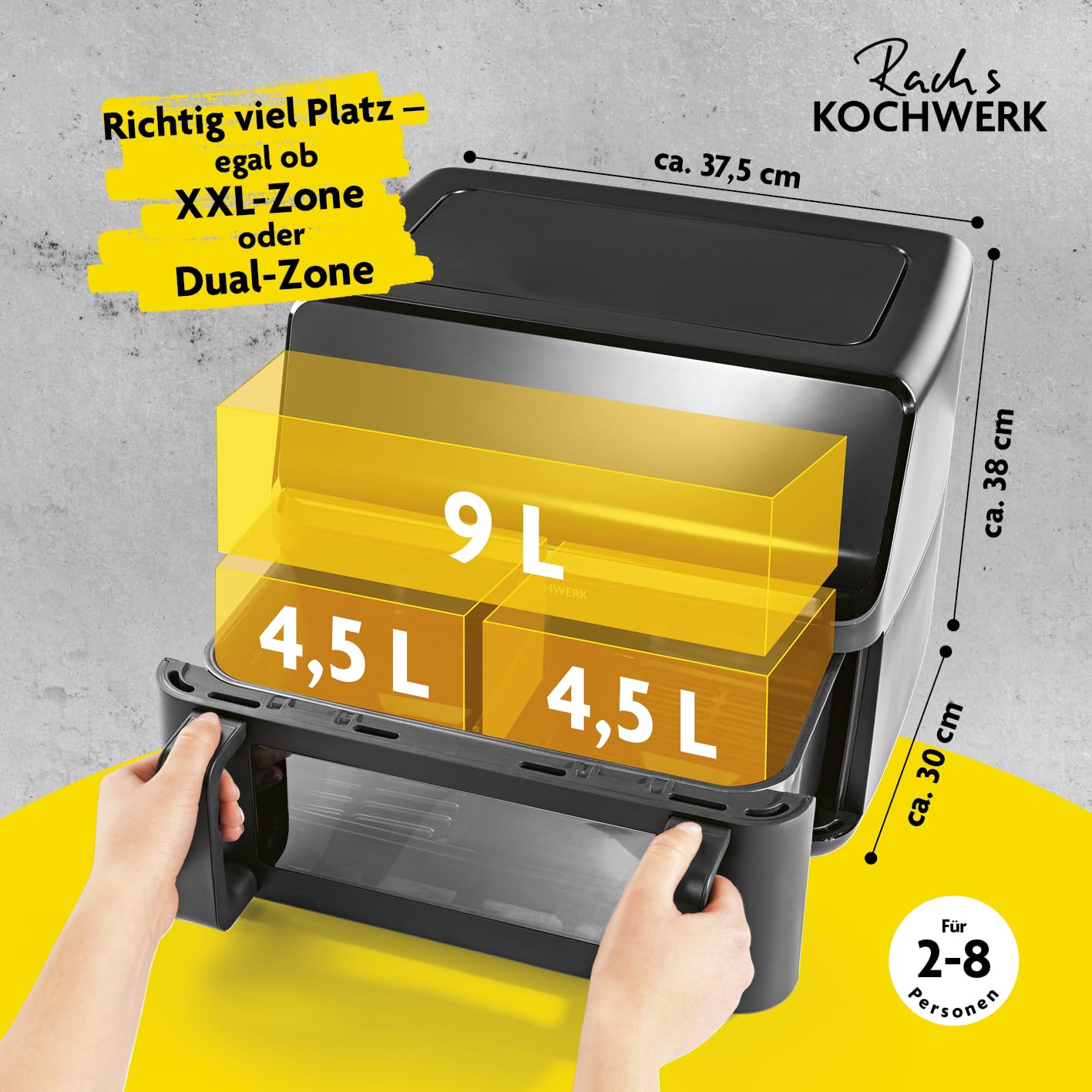 - Gesamtkapazität: 9 Liter (teilbar in 2 x 4,5 Liter)