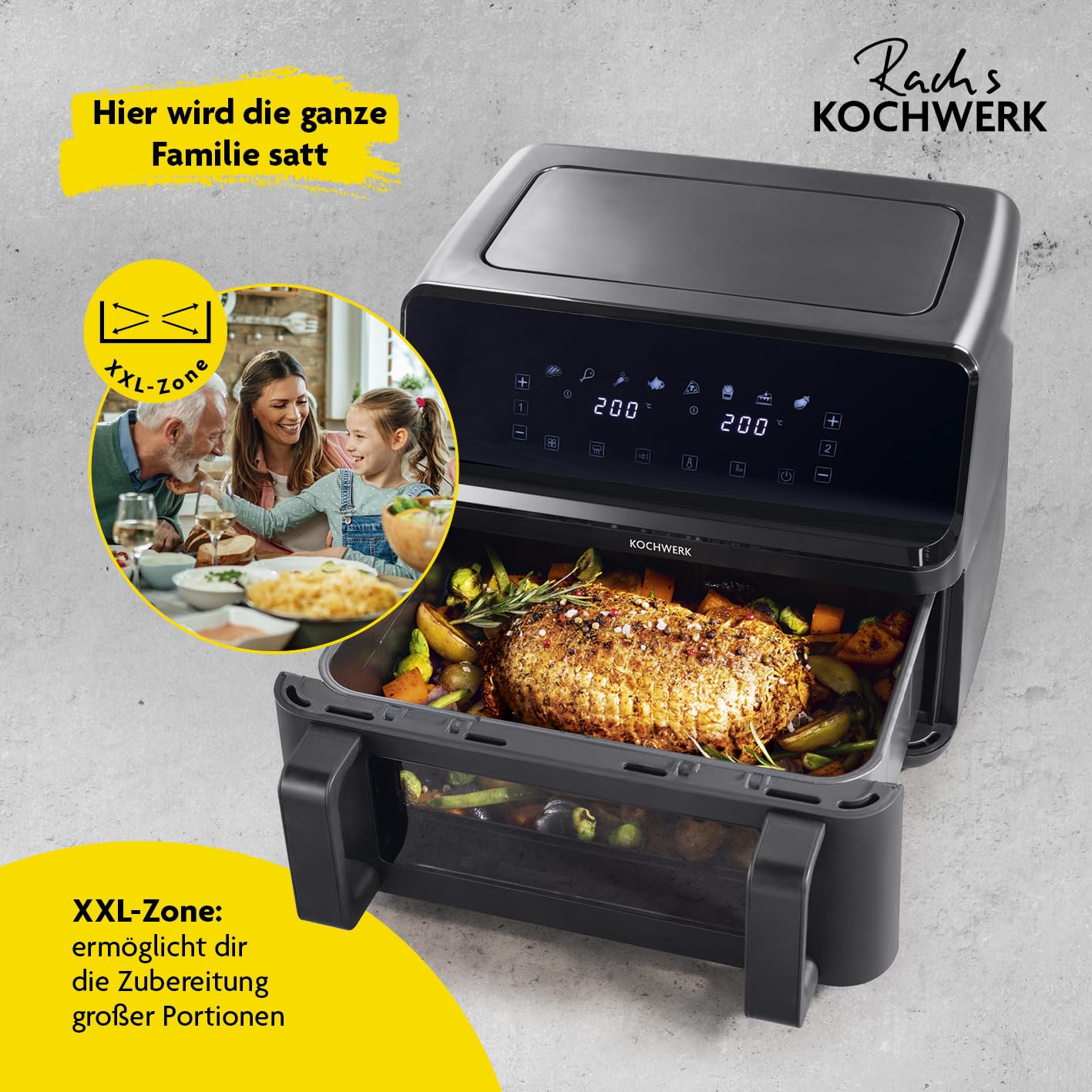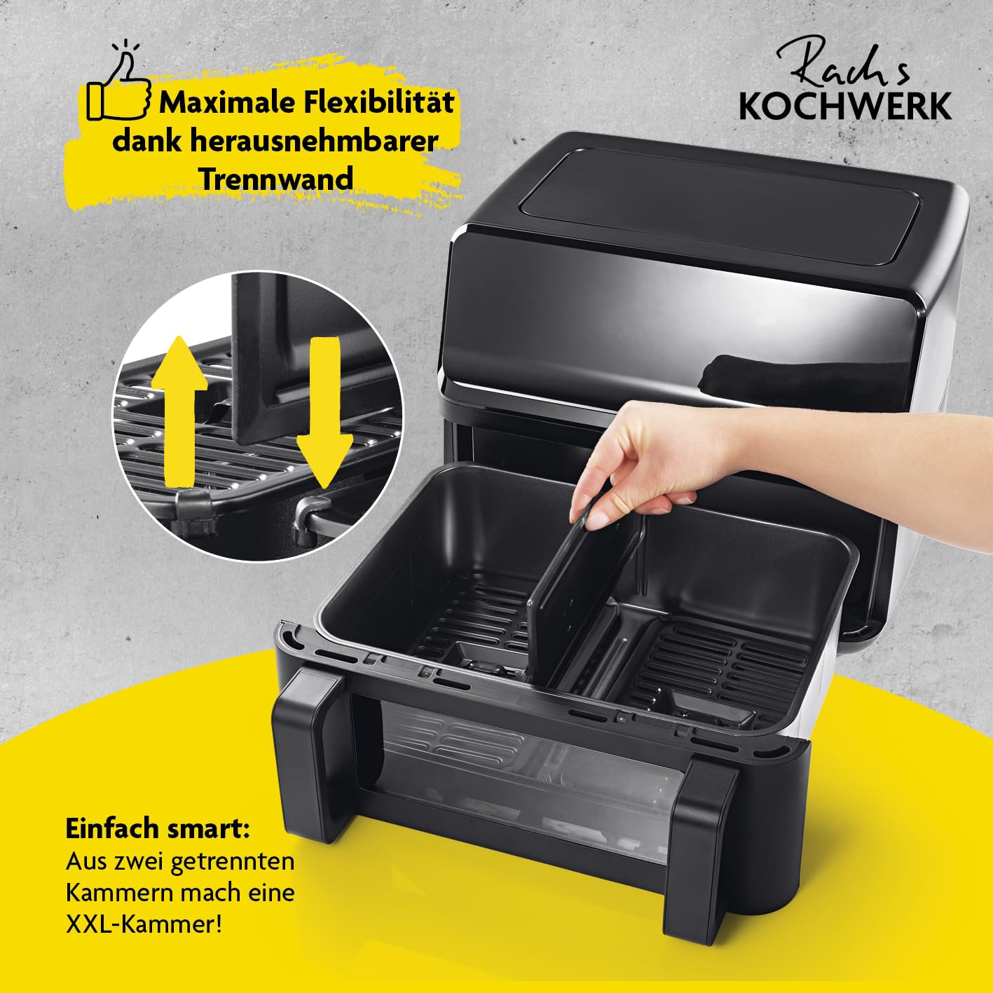 Der entscheidende Vorteil ist die Flexibilität. Statt zwei fest verbauter, kleinerer Körbe verfügt dieses Modell über einen einzigen, durchgehenden 9-Liter-XXL-Garraum. Diesen können Sie für grosse Gerichte wie ein ganzes Hähnchen oder eine Familien-Lasagne nutzen. Bei Bedarf setzen Sie einfach die Trennwand ein und schaffen so zwei separate 4,5-Liter-Zonen, um unterschiedliche Speisen gleichzeitig zuzubereiten.