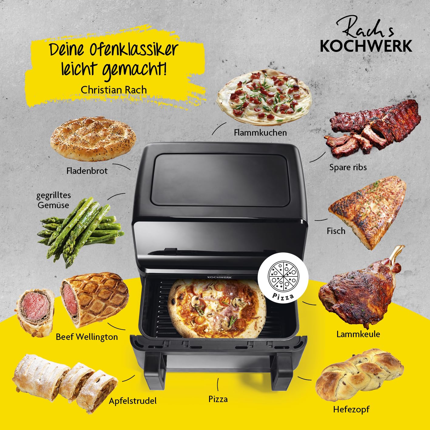 Die grosszügige 9-Liter-Kapazität ist für Familienportionen ausgelegt. Sie fasst mühelos grosse Speisen wie Spareribs, ein grosses Lachsfilet, bis zu acht Portionen Pommes frites oder eine Tiefkühlpizza mit bis zu 26 cm Durchmesser. Ein besonderer Vorteil ist, dass Sie auch Ihre eigene, passende Auflaufform verwenden können, um beispielsweise eine Lasagne direkt im Gerät zuzubereiten.
