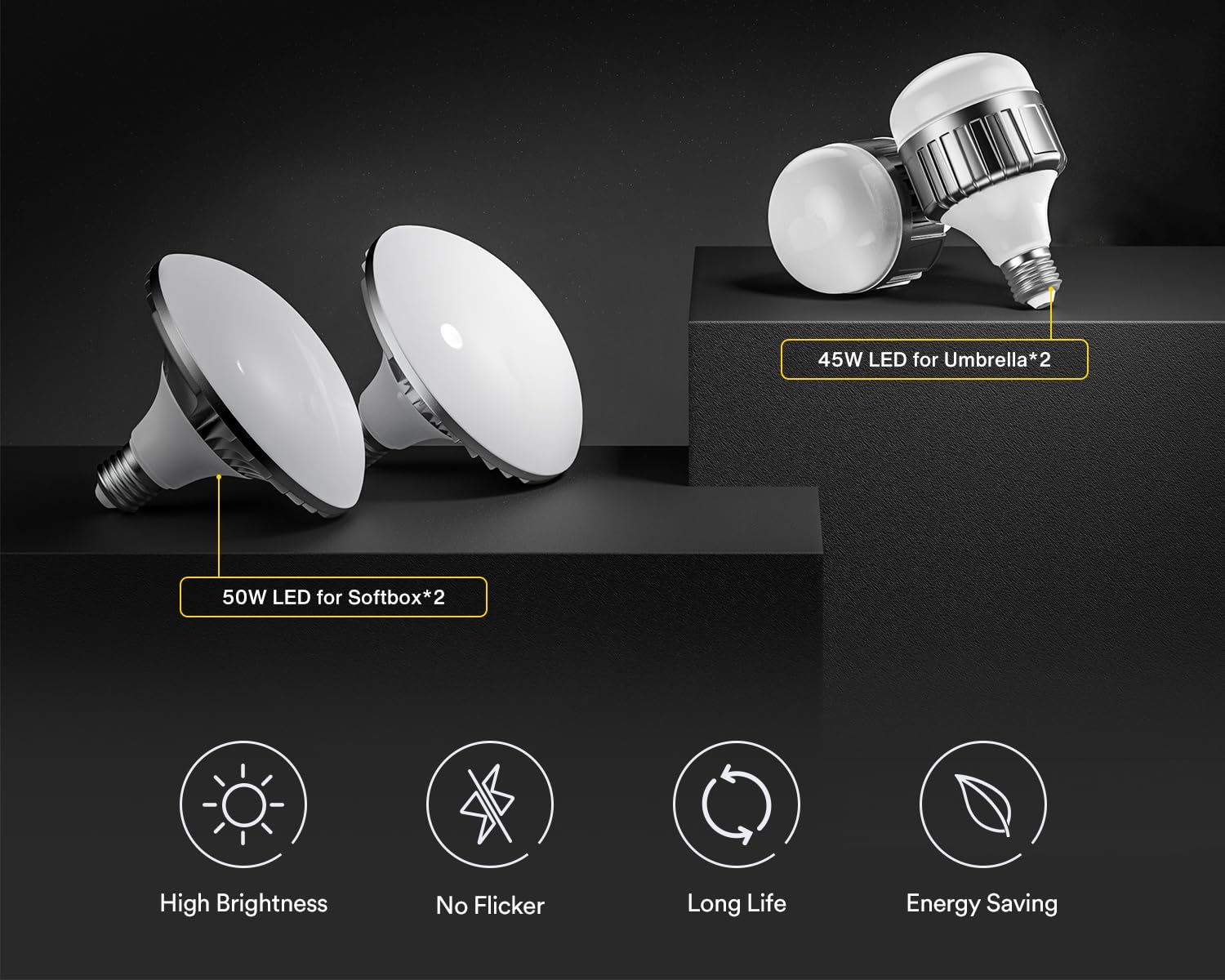 - Langlebige LED-Lampen: Das Set enthält zwei 50-W-LEDs für die Softboxen und zwei 45-W-LEDs für die Schirme. Geschützt durch einen PC-Lampenschirm und eine Aluminiumhalterung, bieten sie ein helles, flimmerfreies Licht mit niedrigem Energieverbrauch und einer Lebensdauer von rund 30'000 Stunden.