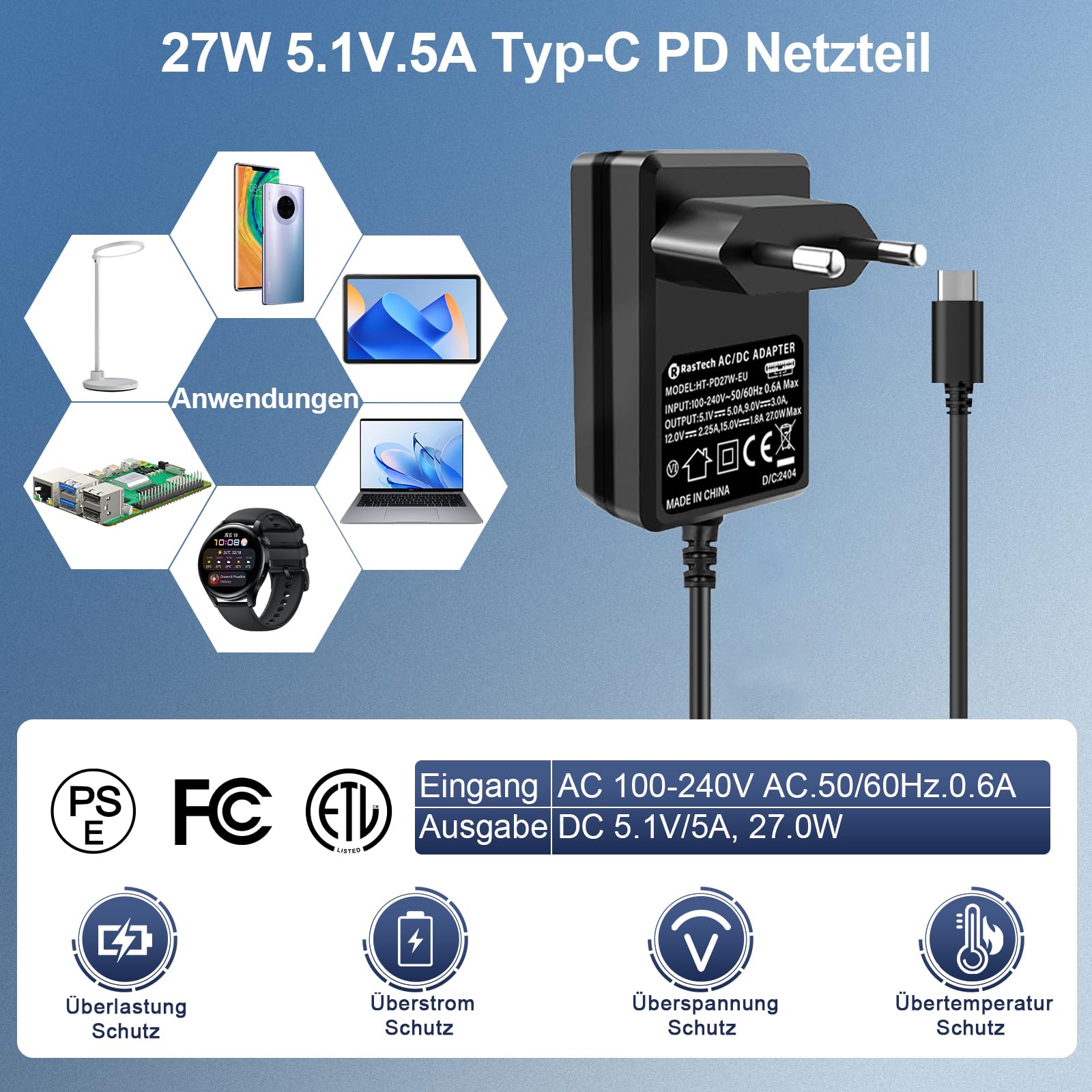 - Stromversorgung: Offizielles 27W USB-C Netzteil (5.1V / 5A)