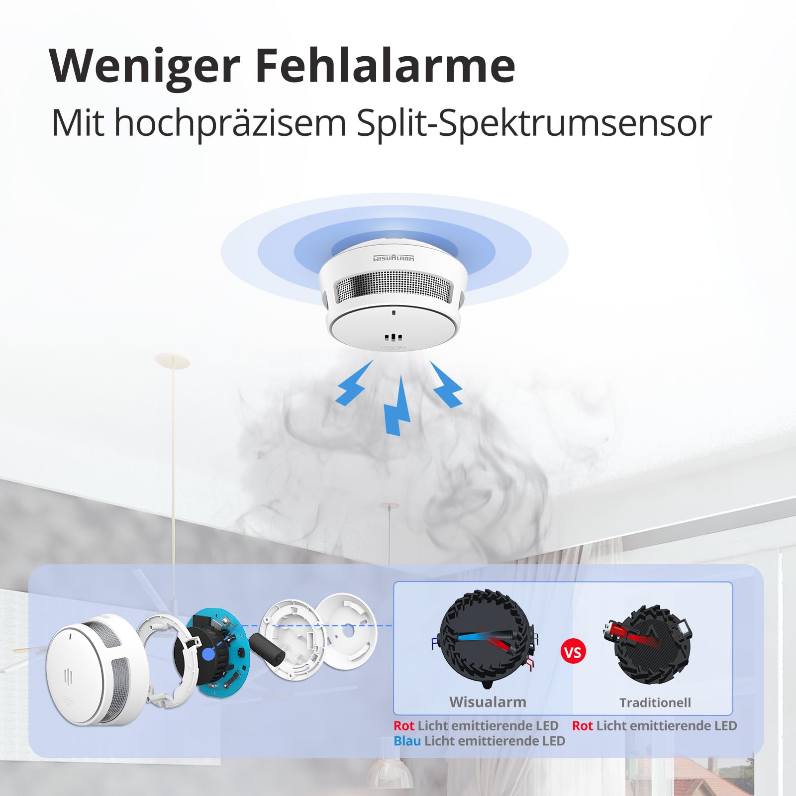 - Zuverlässige Raucherkennung: Die innovative Split-Spektrum-Technologie unterscheidet präzise zwischen echtem Rauch, Wasserdampf oder Staub und minimiert so das Risiko von Fehlalarmen massiv.