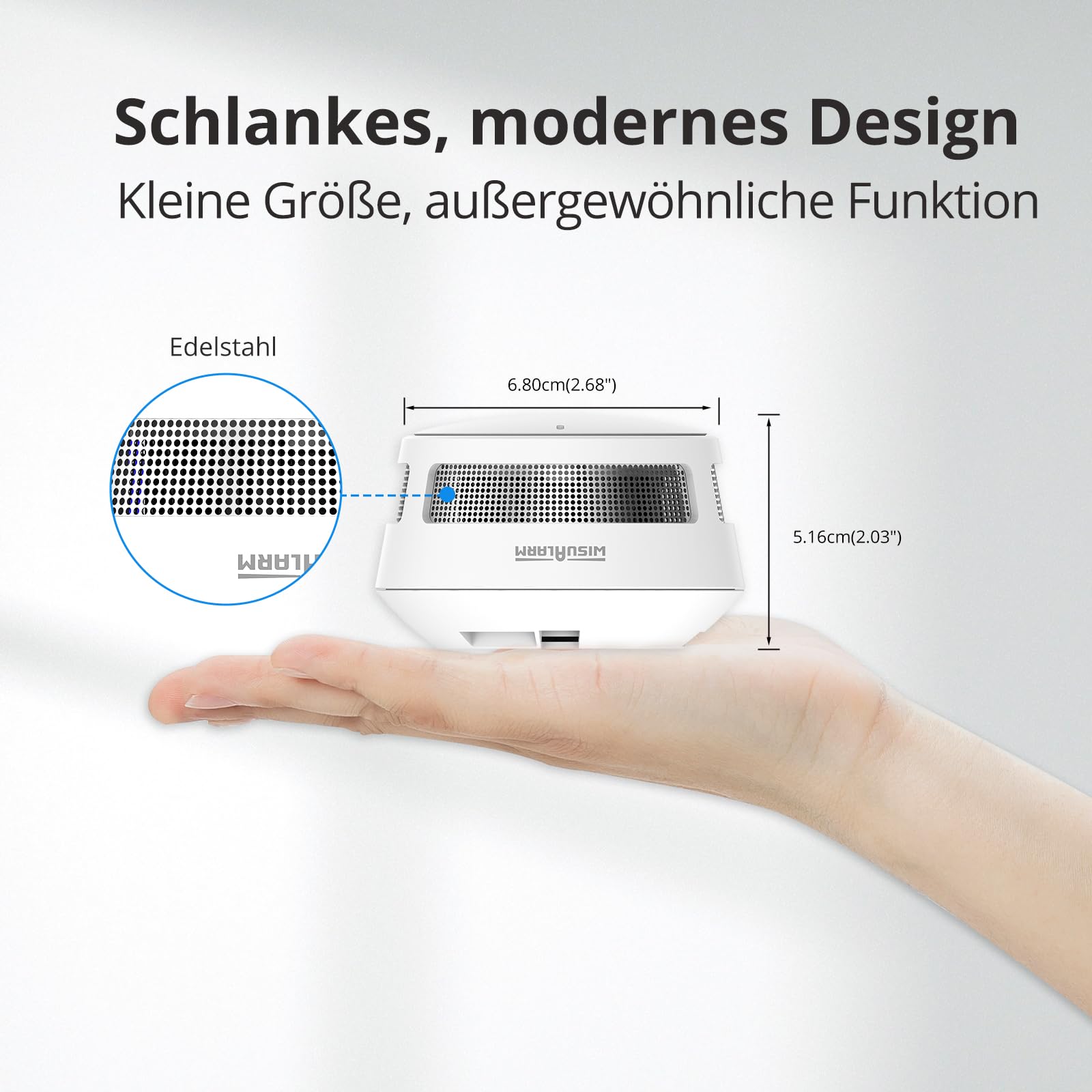 - Modernes Design: Das schlanke Gehäuse mit einem rostfreien Einlass fügt sich dezent in jede Wohnumgebung ein und verleiht Ihren Räumen einen Hauch von moderner Technik.