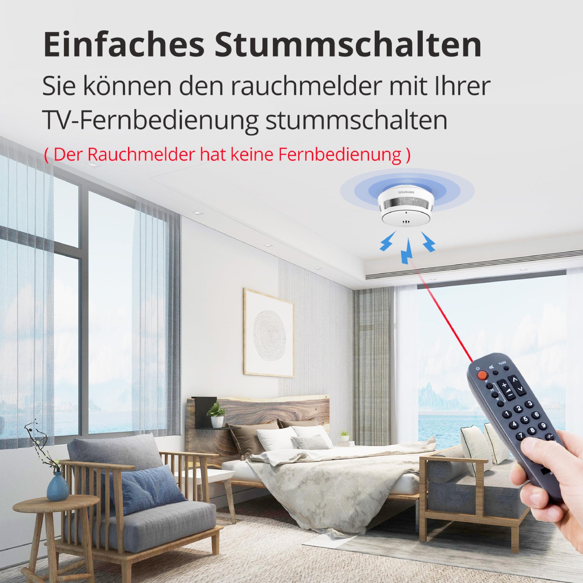 - Bequeme Stummschaltung: Ein Fehlalarm, beispielsweise durch Kochdampf, lässt sich ganz einfach mit Ihrer vorhandenen TV-Fernbedienung temporär deaktivieren. Es wird keine separate Fernbedienung benötigt.