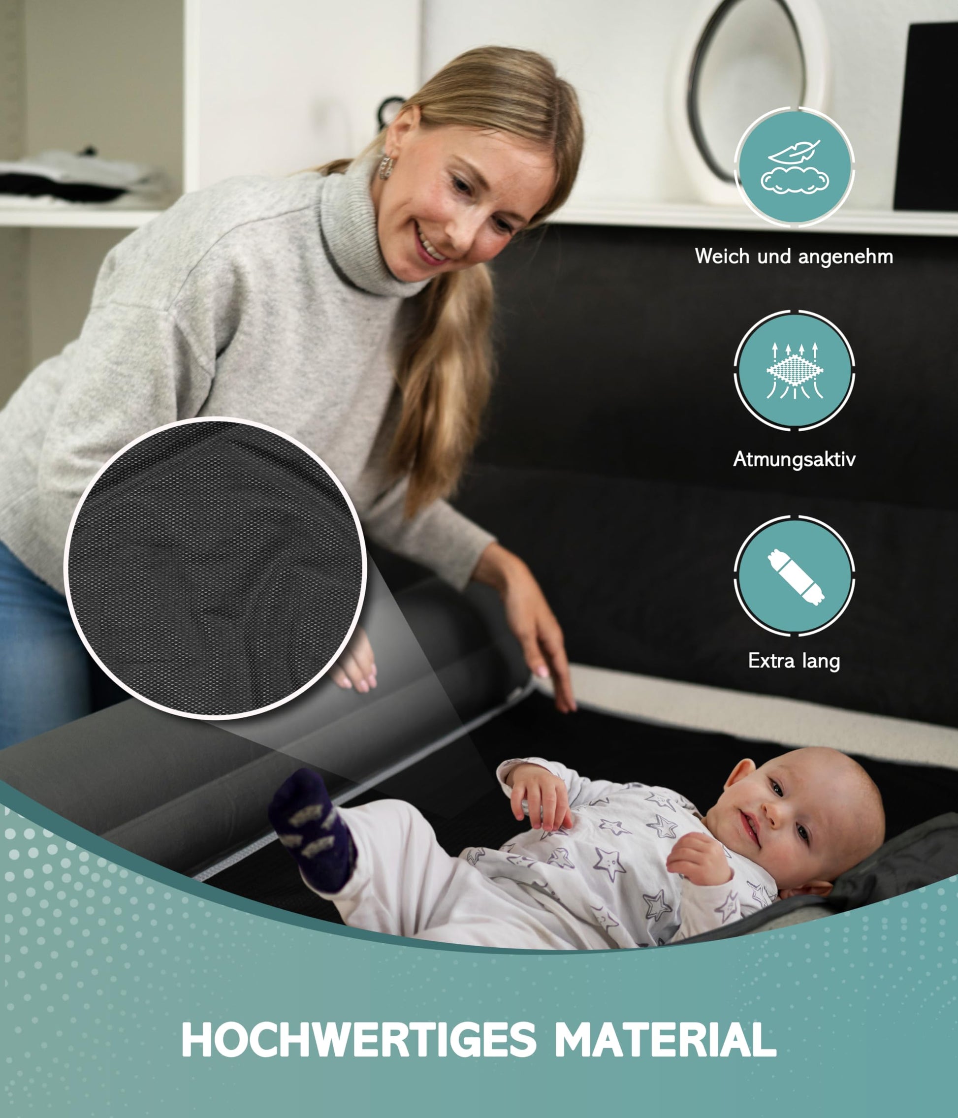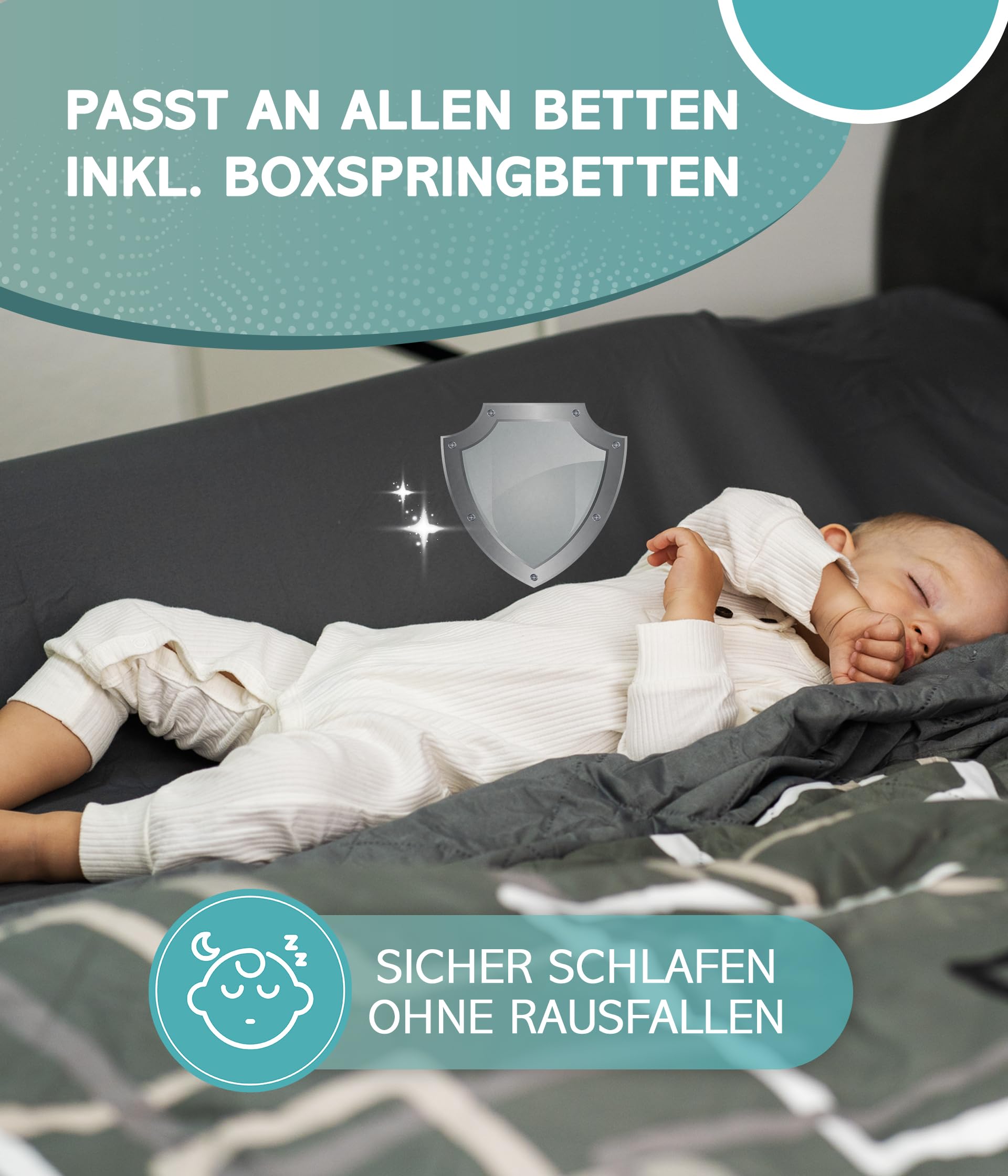 Geniessen Sie die Gewissheit, dass Ihr Kind jederzeit sicher schläft. Ob im eigenen Bett, bei den Grosseltern oder im Hotelzimmer – dieser Rausfallschutz passt sich flexibel an jede Umgebung an. Das robuste, von Experten geprüfte Material macht ihn zu einer dauerhaften Lösung für den Alltag und dank des leichten Designs zum unverzichtbaren Reiseaccessoire.