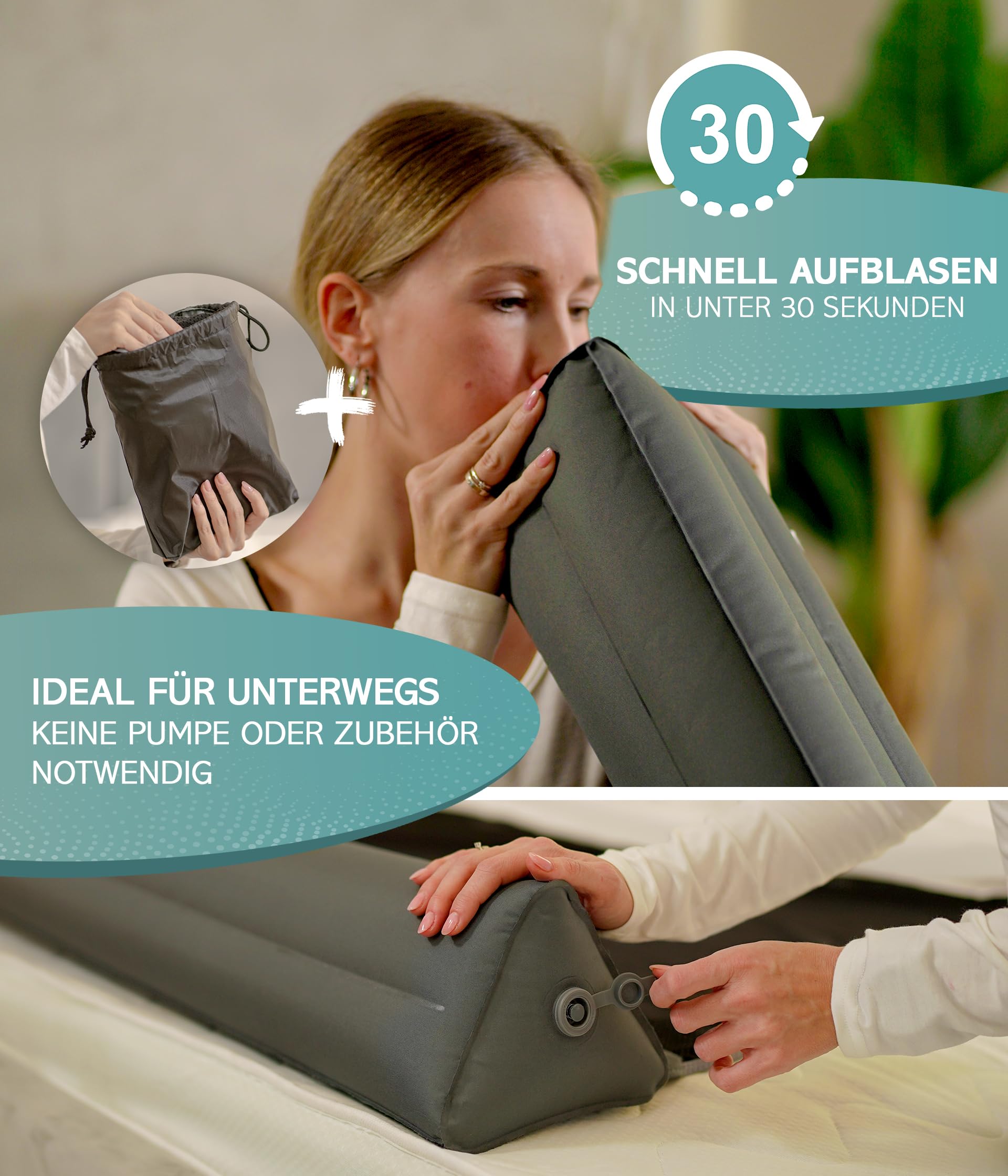 Unser aufblasbarer Rausfallschutz ist universell konzipiert und eignet sich für alle gängigen Bettarten, einschliesslich Boxspringbetten, klassischen Betten mit Lattenrost und sogar für Reisebetten im Hotel oder bei den Grosseltern.