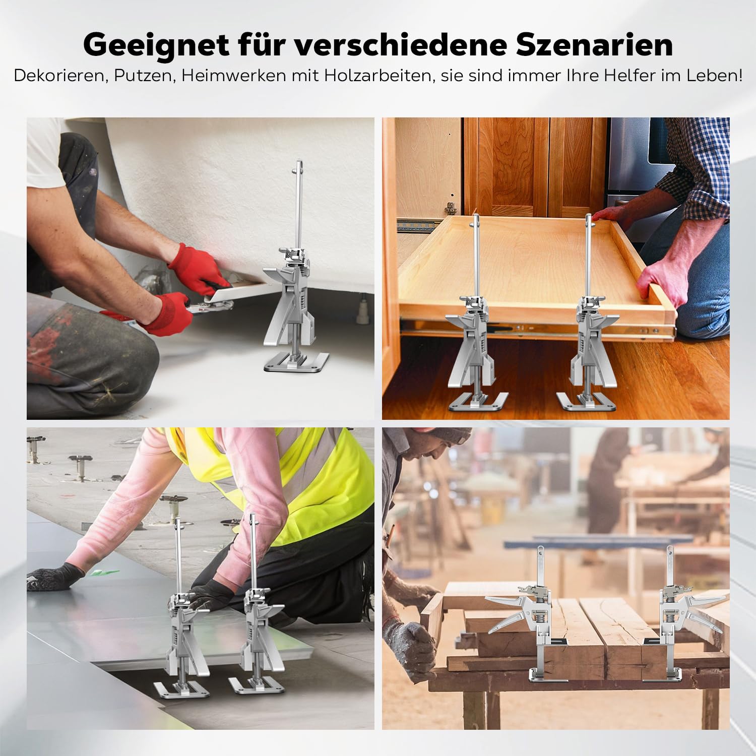 Das Set ist ein vielseitiger Helfer für Profis und Heimwerker. Es eignet sich perfekt für anspruchsvolle Montage- und Renovationsarbeiten, wie das Anheben von Schränken, das Einsetzen von Türen und Fenstern oder das Ausrichten schwerer Haushaltsgeräte.