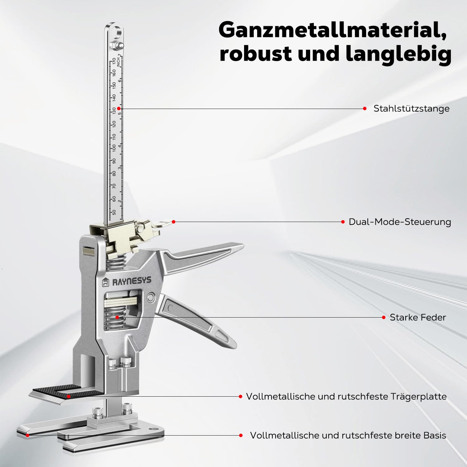 Die Heber verfügen über eine robuste Ganzmetall-Konstruktion aus langlebigem Edelstahl und Aluminium für maximale Stabilität. Sie werden komplett montiert geliefert und sind sofort nach dem Auspacken einsatzbereit.