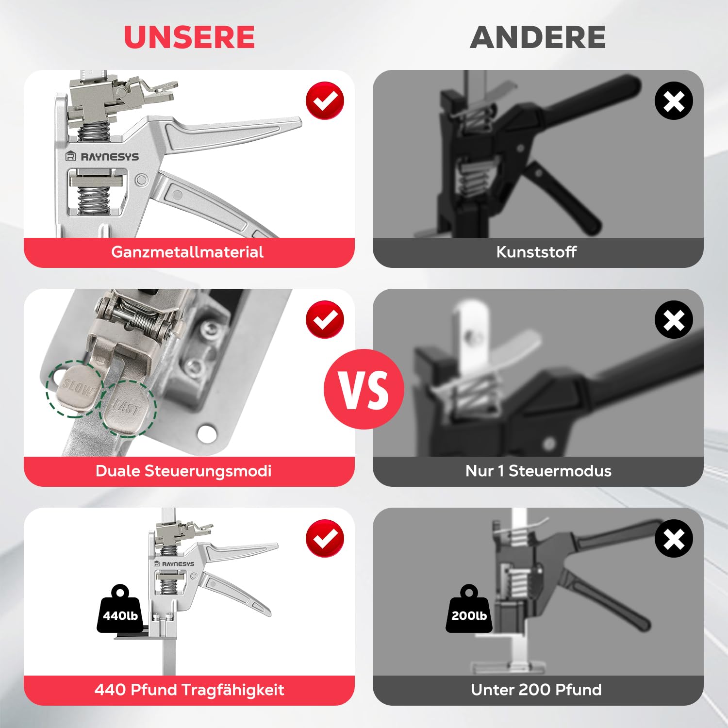 Das Set kann zuverlässig Lasten von bis zu 200 kg (440 lbs) bewältigen. Es ist damit ideal zum Anheben schwerer Objekte wie Möbel, Türen, Kühlschränke oder beim Verlegen von Fliesen.