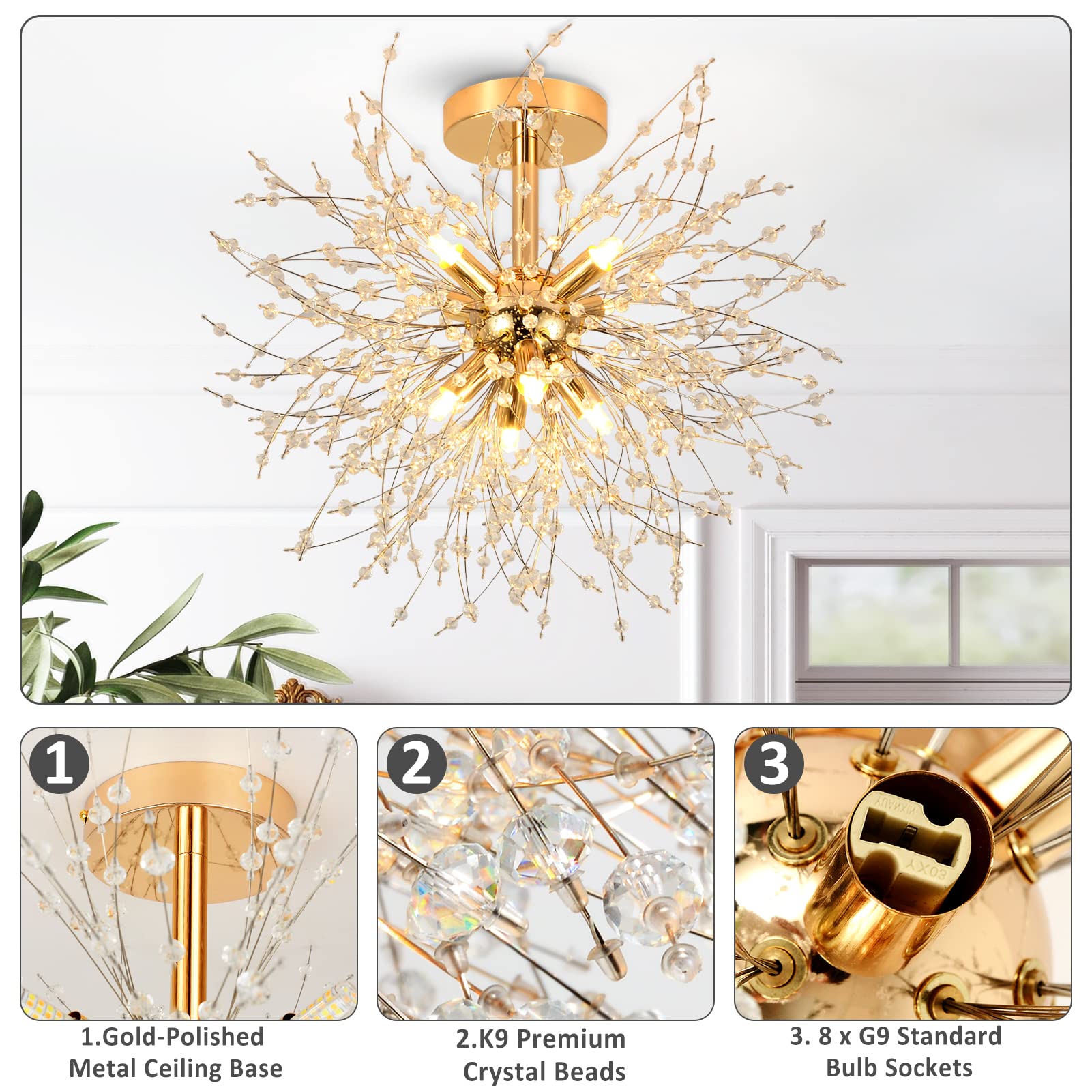 - Flexible Beleuchtung: Ausgestattet mit acht G9-Fassungen, die mit verschiedenen Leuchtmitteltypen wie LED, Halogen oder CFL bis maximal 40 Watt kompatibel sind.