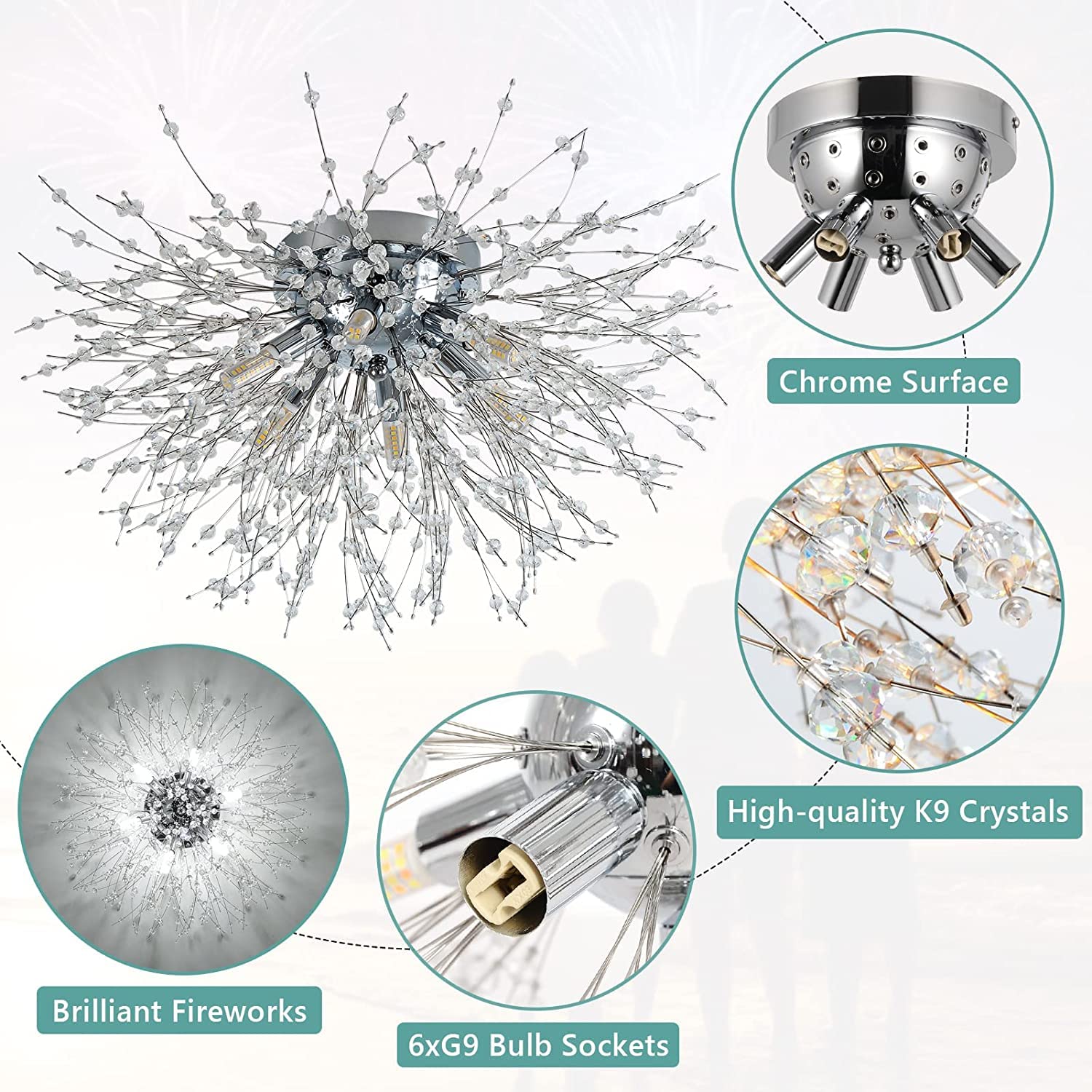 - Exklusives Feuerwerk-Design: Gefertigt aus hochwertigem K9-Kristall und verchromtem Metall, das für einen modernen und luxuriösen Stil sorgt.