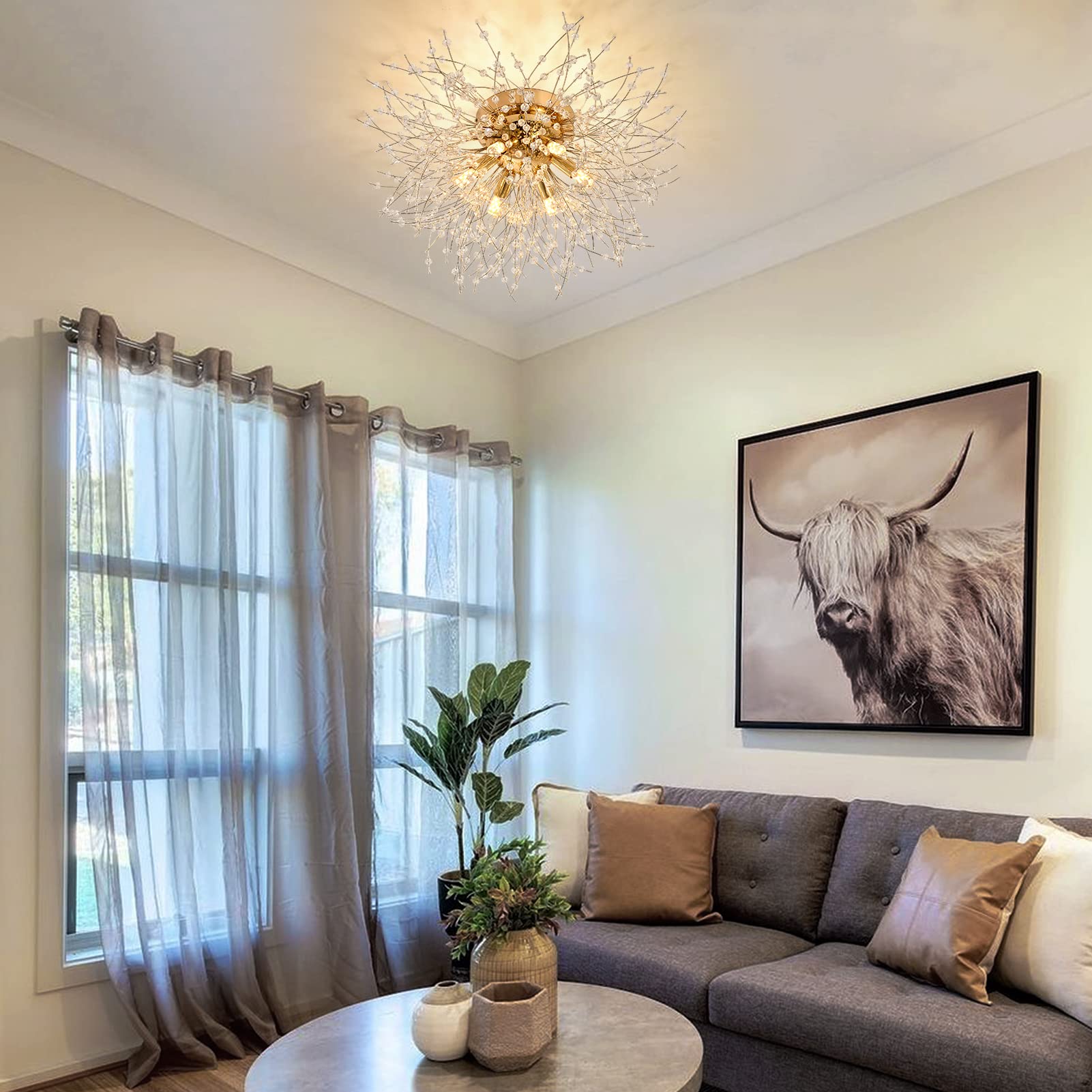 Verleihen Sie Ihrem Zuhause mit dieser eindrucksvollen Kristall-Deckenleuchte einen Hauch von Glamour und modernem Design. Ihre einzigartige Form, inspiriert von einem Feuerwerk oder einem Löwenzahn, macht sie zum strahlenden Mittelpunkt in jedem Raum.