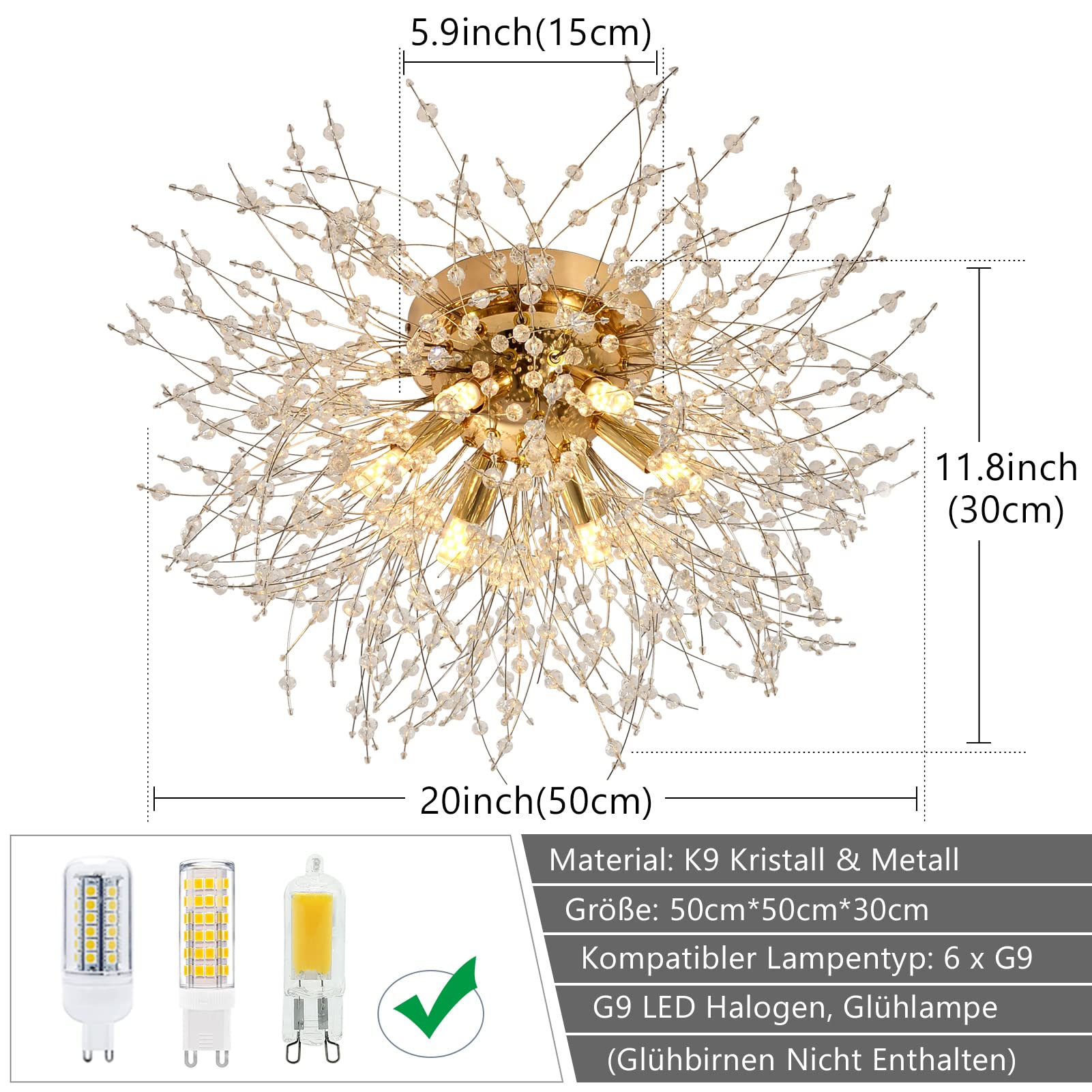 - Abmessungen: Die Leuchte hat einen Durchmesser von 50 cm, die einzelnen Kristalläste sind 12 cm lang.