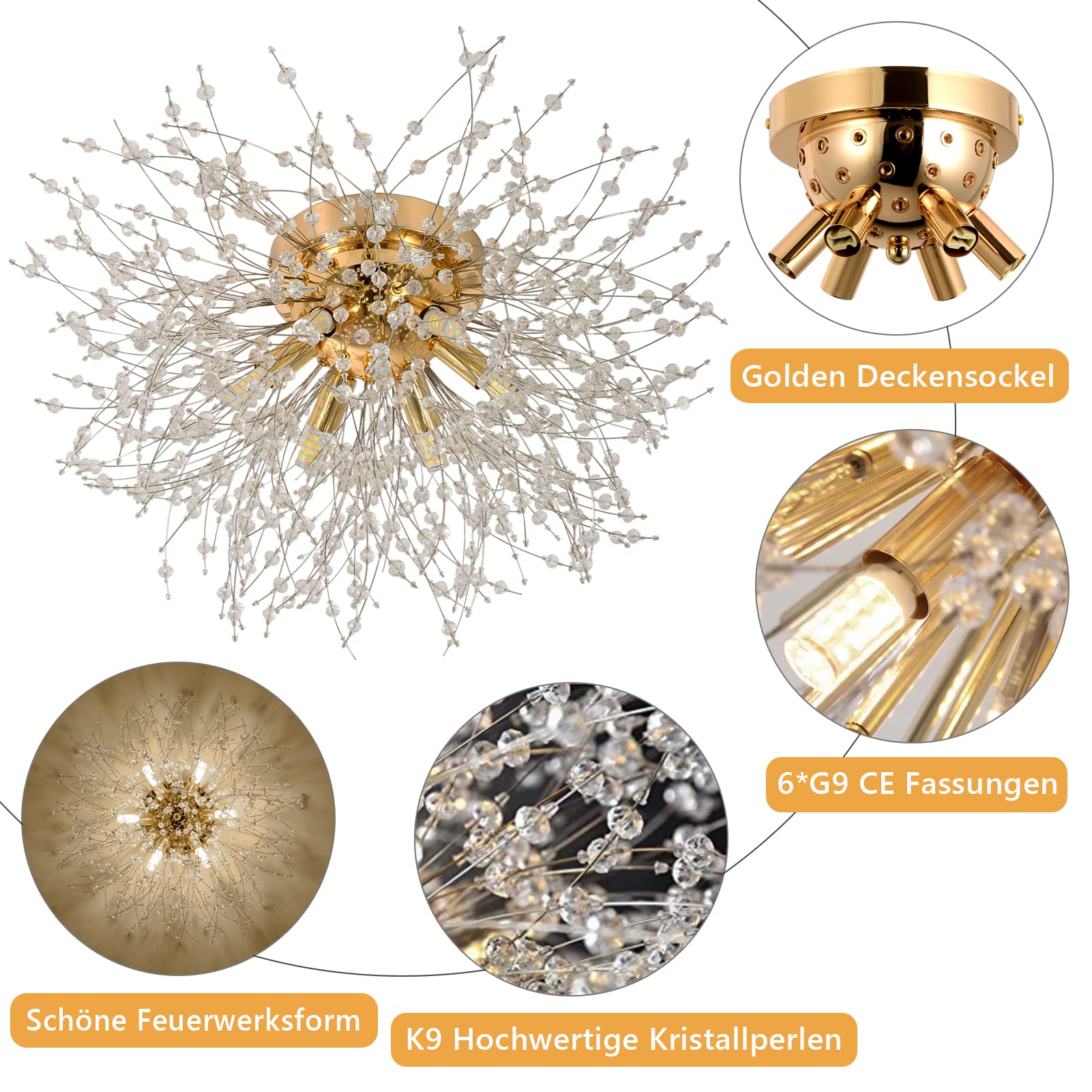 - Modernes Design: Eine exquisite Kombination aus einem goldenen Finish und zahlreichen funkelnden Kristallen, die eine warme und elegante Atmosphäre schaffen.