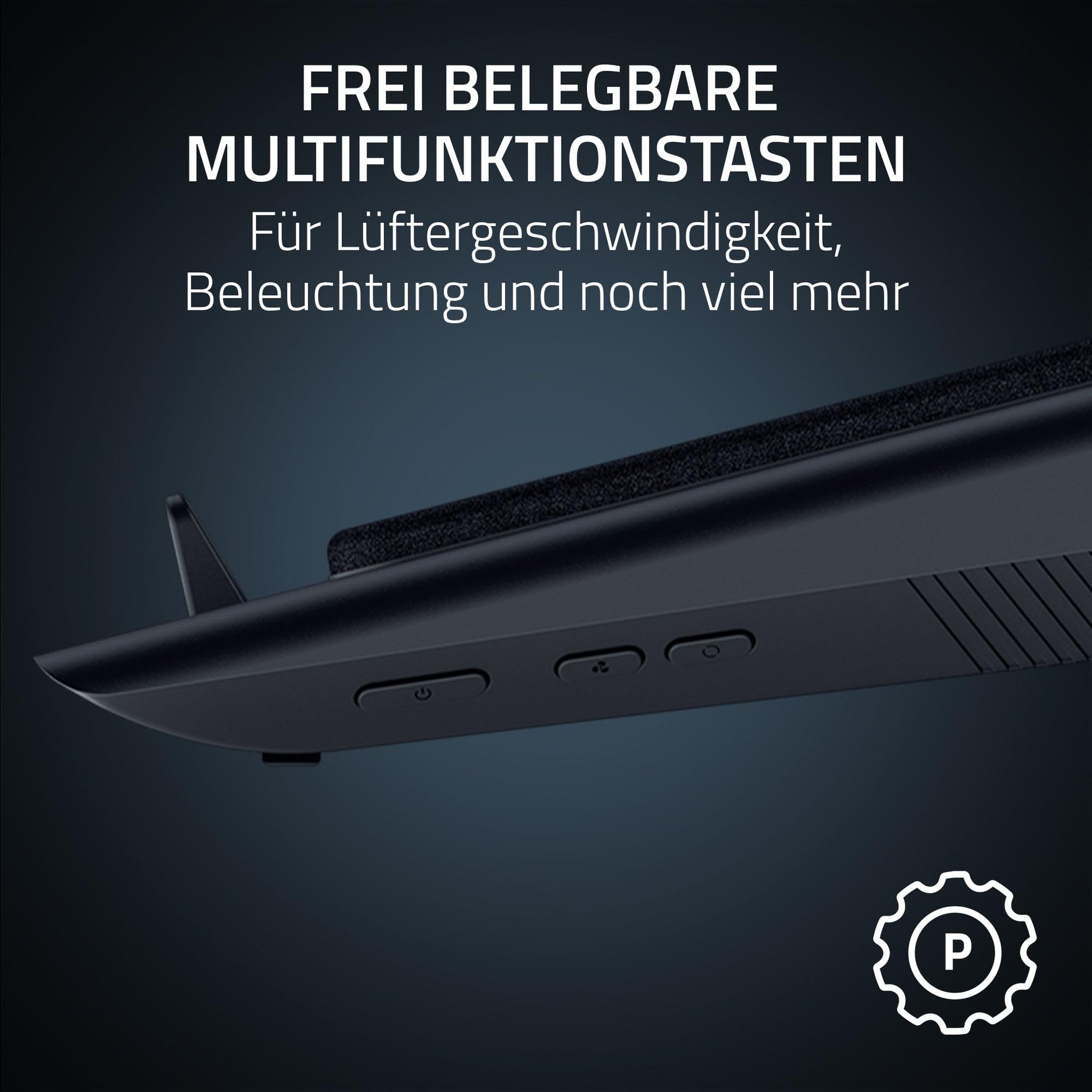 Absolut. Über die Razer Synapse Software können Sie aus vordefinierten Lüfterkurven wählen oder Ihr eigenes Kühlprofil erstellen, um die Leistung perfekt abzustimmen. Die Razer Chroma RGB-Beleuchtung und die Lüftergeschwindigkeit lassen sich auch direkt über Multifunktionstasten am Ständer steuern.